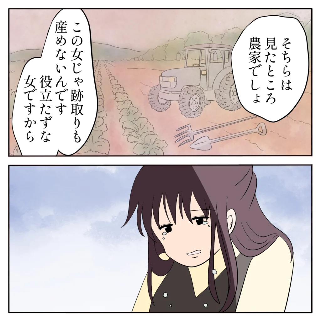 さらに元夫は「そちらは見たところ農家でしょ。この女じゃ跡取りも産めないんです。役立たずな女ですから」とユリを見下す発言。子どもを産めないことに負い目を感じているユリは堪らず泣き出しました。俺はユリを傷つける元夫に強い怒りを感じました。