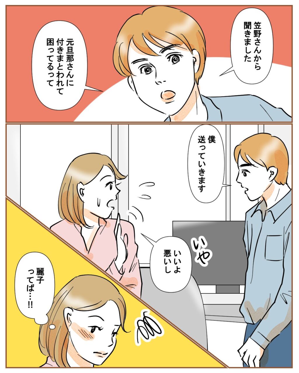 「笠野さんから聞きました、元旦那さんに付きまとわれて困ってるって・・・僕送っていきます」佐藤さんからの突然の申し出に、思わず言葉を失いました。笠野さんって、完全に麗子の仕業だな。私は慌てて「いや、いいよ悪いし」と断ります。