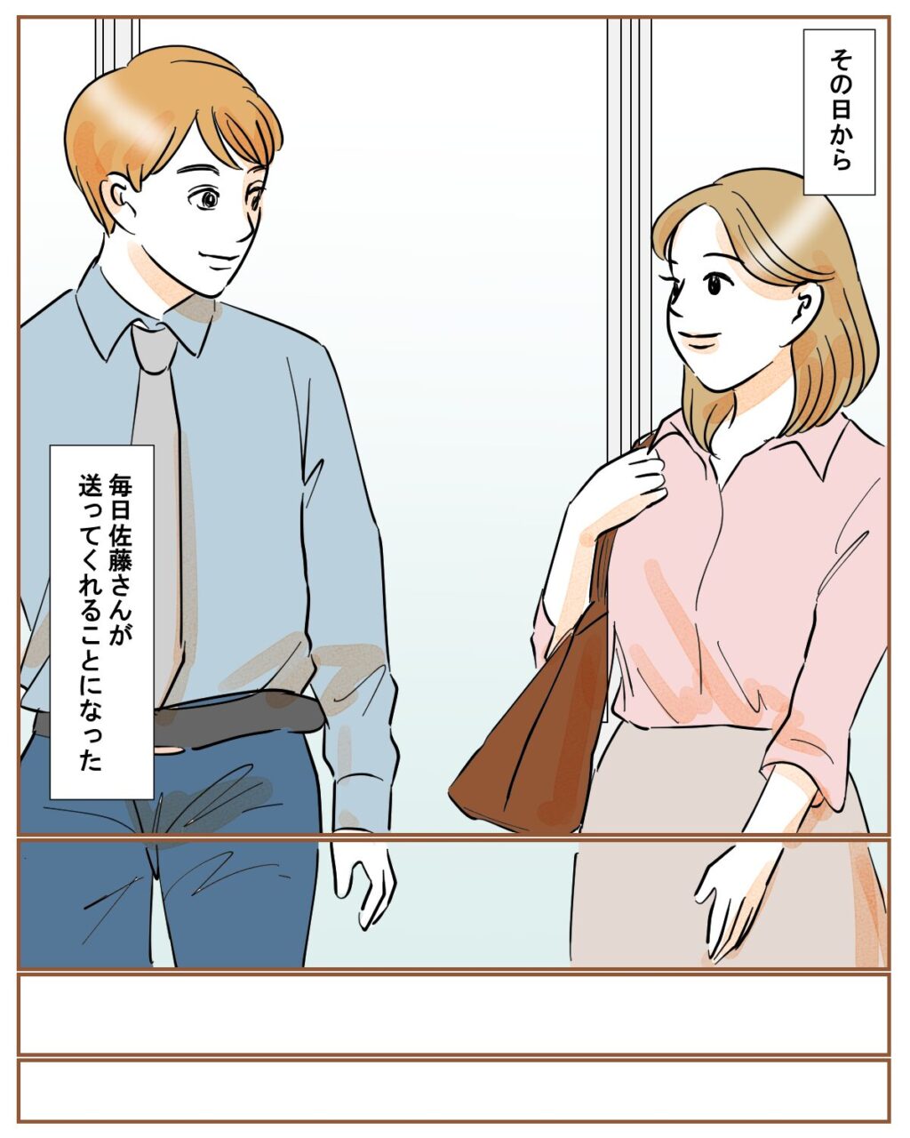麗子さんのおかげで、以前から気になっていた佐藤さんと毎日一緒に帰れるようになった美香さん。不安な出来事から生まれた、思いがけない嬉しい変化。これをきっかけに、2人の距離が少しずつ縮んでいくといいですね。