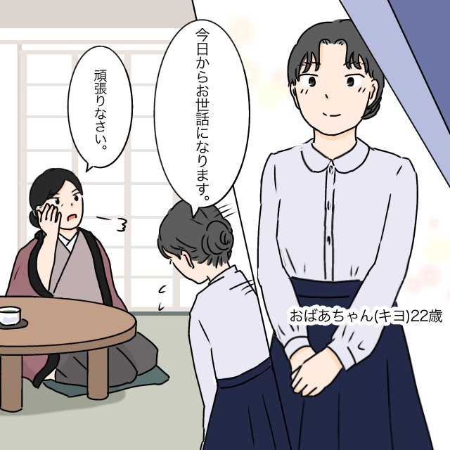 時はさかのぼり、義祖母もとい「キヨさん」がまだ22歳だった頃のこと、山ノ中家へ嫁として迎えられました。キヨさんのお姑さんはかなり厳しい人だったそうで、嫁いだ初日も「今日からお世話になります」と頭を下げたキヨさんに、「頑張りなさい」威圧するような一言を放ちました。