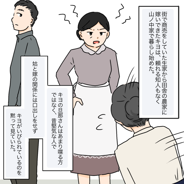 街で商売をしていた生家から田舎の農家に嫁いできたキヨさんは、頼れる知人もなく、山ノ中家で暮らし始めました。キヨさんの夫はあまり喋る方ではなく昔堅気な人で、姑と嫁の関係には口出しをせず、キヨさんがいびられているのをただ黙って見ていたそうです。