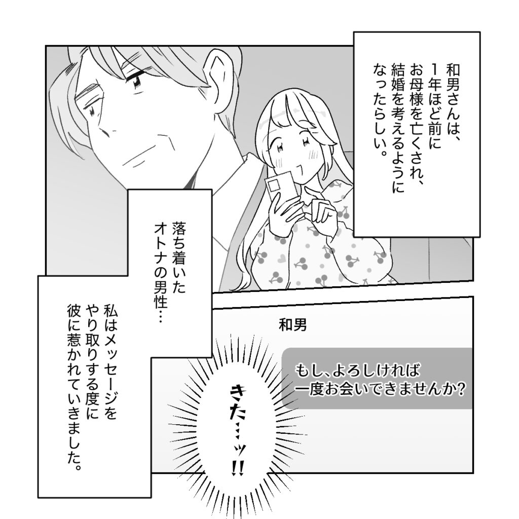 和男さんは、1年ほど前にお母様を亡くされ、結婚を考えるようになったそう。落ち着いたオトナの男性・・。私はメッセージのやり取りをする度に彼に惹かれていきました。そんなある日、ついに彼から「もしよろしければ一度お会いできませんか?」とメッセージをもらい、思わず「きた・・ッ!!」と心の中でガッツポーズ!