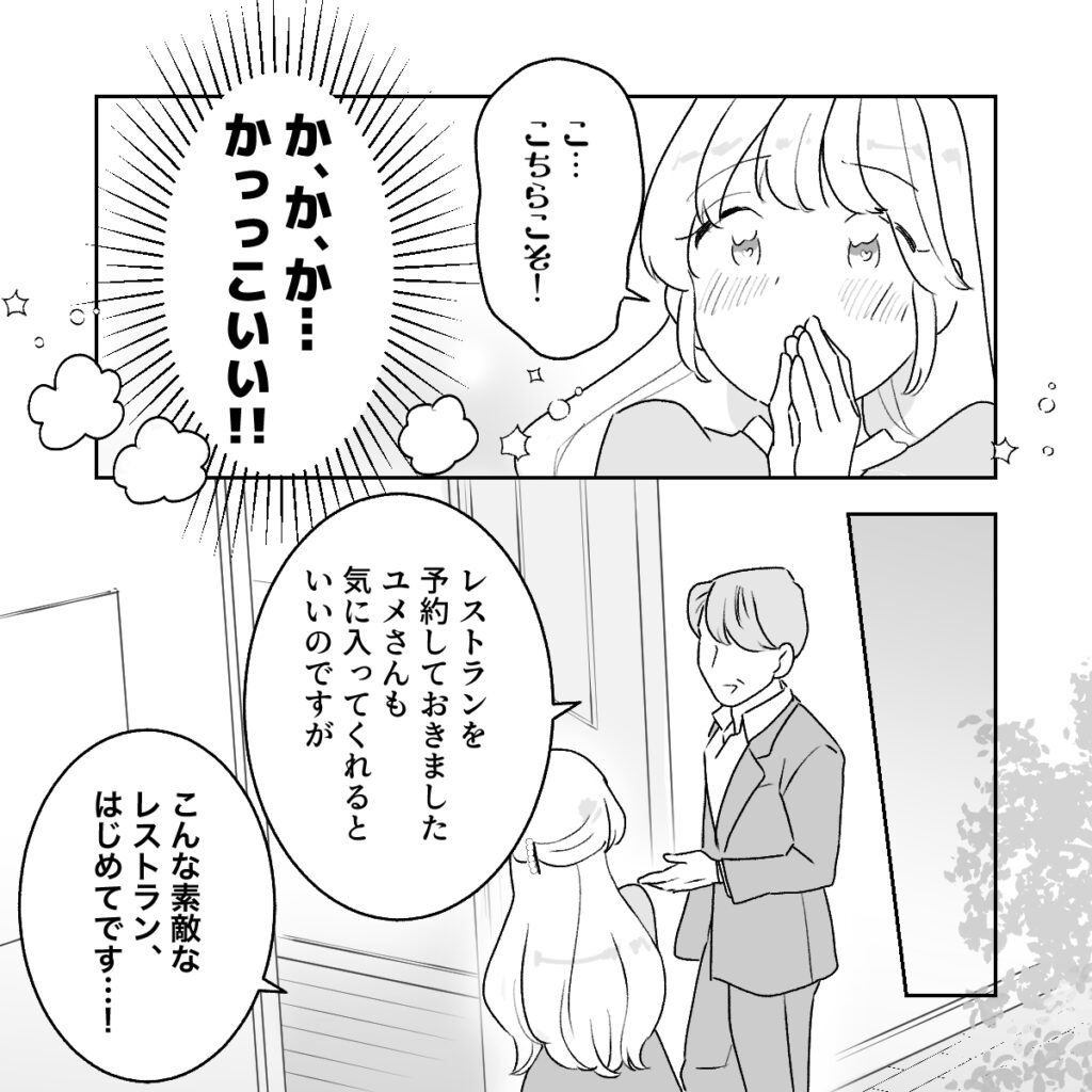 「こ・・こちらこそ!」そう返しながら、目は和男さんに釘付け。か、か、か・・かっこいい!!「レストランを予約しておきました。ユメさんも気に入ってくれるといいのですが」と和男さんが連れていってくれたのは、とってもおしゃれなレストラン。「こんな素敵なレストラン、はじめてです・・!」和男さんのスマートなエスコートにキュンキュンです。