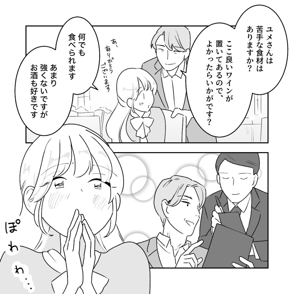自分では行けない高級そうなレストランに緊張していると、和男さんは「ユメさんは苦手な食材はありますか?ここ良いワインが置いてあるので、よかったらいかがです?」と聞いてくれ、「何でも食べられます。あまり強くないですがお酒も好きです」と答えながら、彼の細やかな気遣いにまたまたキュン。その後も、慣れた様子でウェイターさんとやりとりする和男さんに見とれてしまいました。