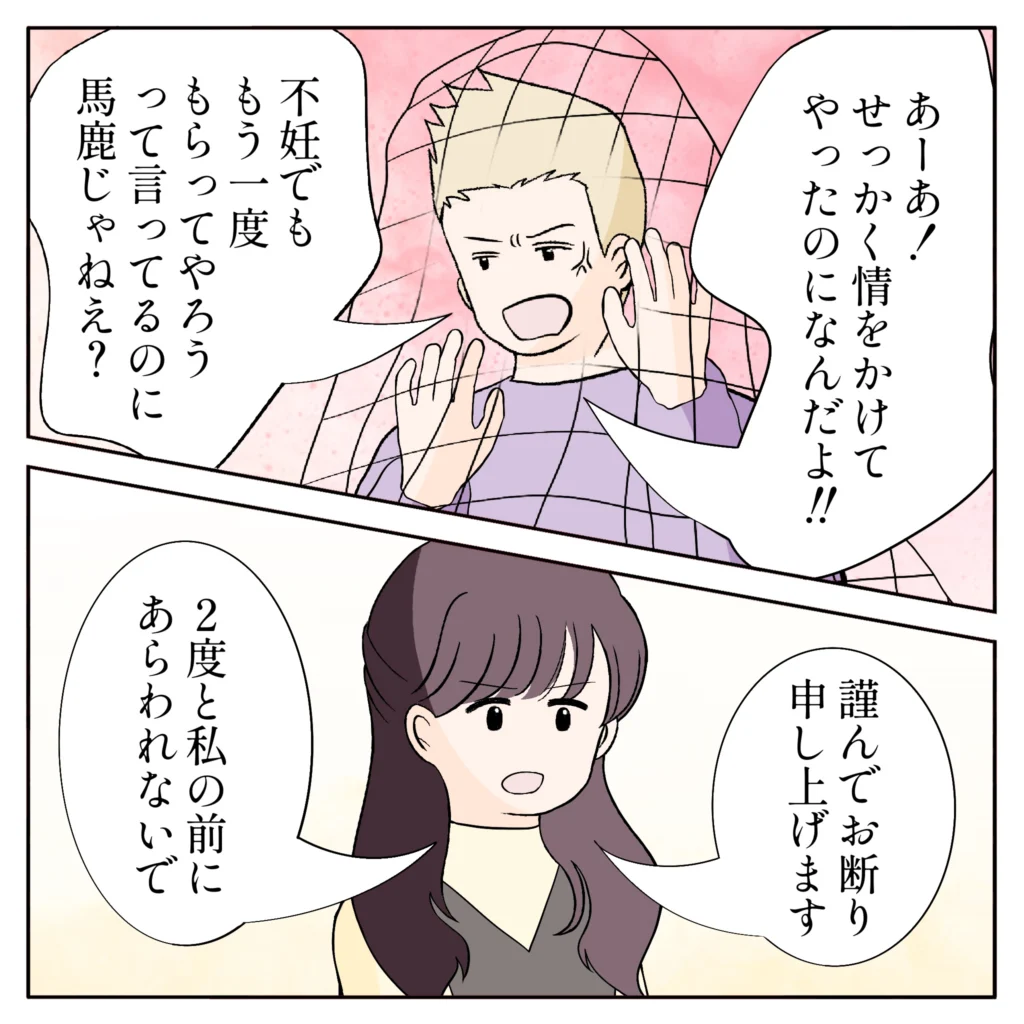 元夫は「あーあ!せっかく情をかけてやったのになんだよ!!不妊でももう一度もらってやろうって言ってるのに馬鹿じゃねぇ?」と負け惜しみの捨て台詞を吐きましたが、ユリは元夫の目を真っ直ぐ見て「謹んでお断り申し上げます。二度と私の前にあらわれないで」と毅然とした態度ではっきり伝えました。
