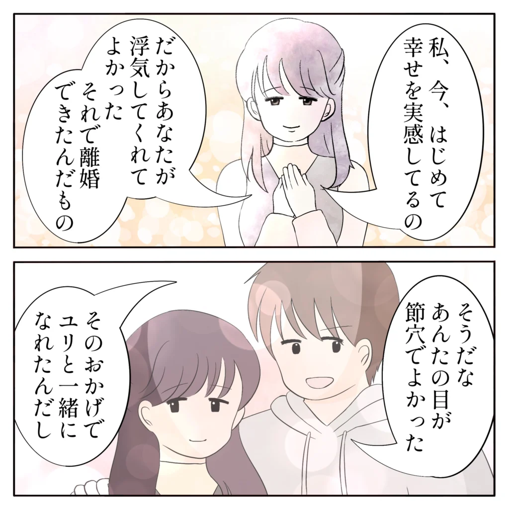「私、今、はじめて幸せを実感してるの。だからあなたが浮気してくれてよかった。それで離婚できたんだもの」と噛み締めるようにユリが言いました。俺は、幸せな2人の姿を元夫に見せつけるように「そうだな。あんたの目が節穴でよかった。そのおかげでユリと一緒になれたんだし」とユリの肩を抱きながら言いました。
