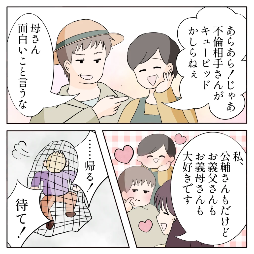 すると、母さんも「あらあら!じゃあ不倫相手さんがキューピッドかしらねぇ」と笑顔で言い、「母さん、面白いこと言うな」と父さんもノリノリ。そんな2人にユリも「私、公輔さんもだけど、お義父さんもお義母さんも大好きです」と笑顔を向け、元夫は完全に蚊帳の外。全く相手にされず「・・帰る!」と怒って歩き出した元夫を、俺は「待て!」と呼び止めました。