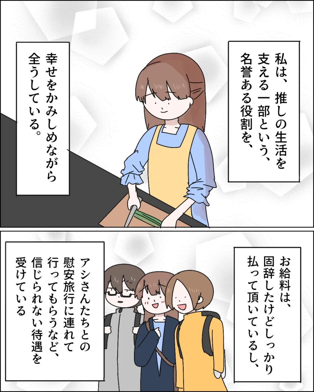 お給料は固辞したけれどしっかり払っていただいているし、アシさんたちとの慰安旅行に連れて行ってもらうなど、信じられない待遇を受けている私。こんな夢のような環境がいまだに信じられずにいました。