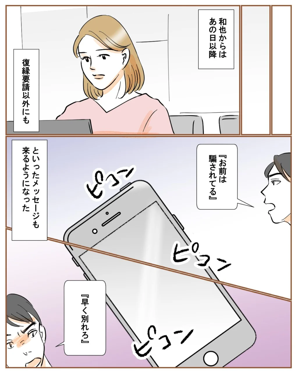 和也からの復縁を迫る連絡は相変わらず来ていたのですが、あの日以降、「お前は騙されてる」「早く別れろ」というメッセージも来るようになりました。私が佐藤さんと付き合っていると思っているようです。