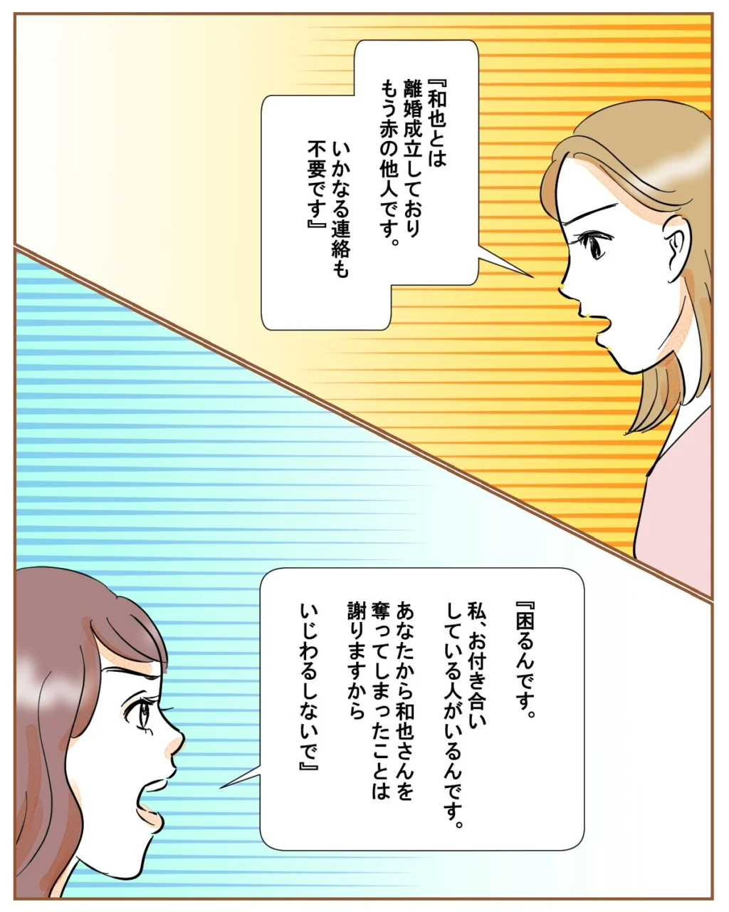 「和也とは離婚成立しており、もう赤の他人です。いかなる連絡も不要です」そう返信すると、すぐに「困るんです。私、お付き合いしている人がいるんです。あなたから和也さんを奪ってしまったことは謝りますからいじわるしないで」と返信が届きました。和也への文句を私に言われても・・困るのはこっちです。