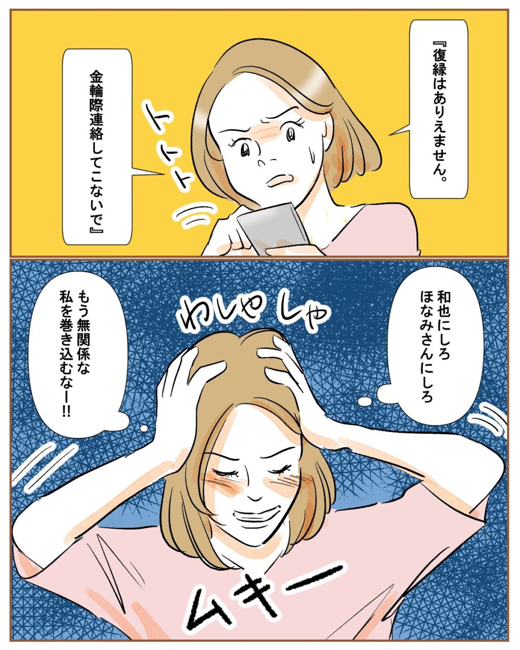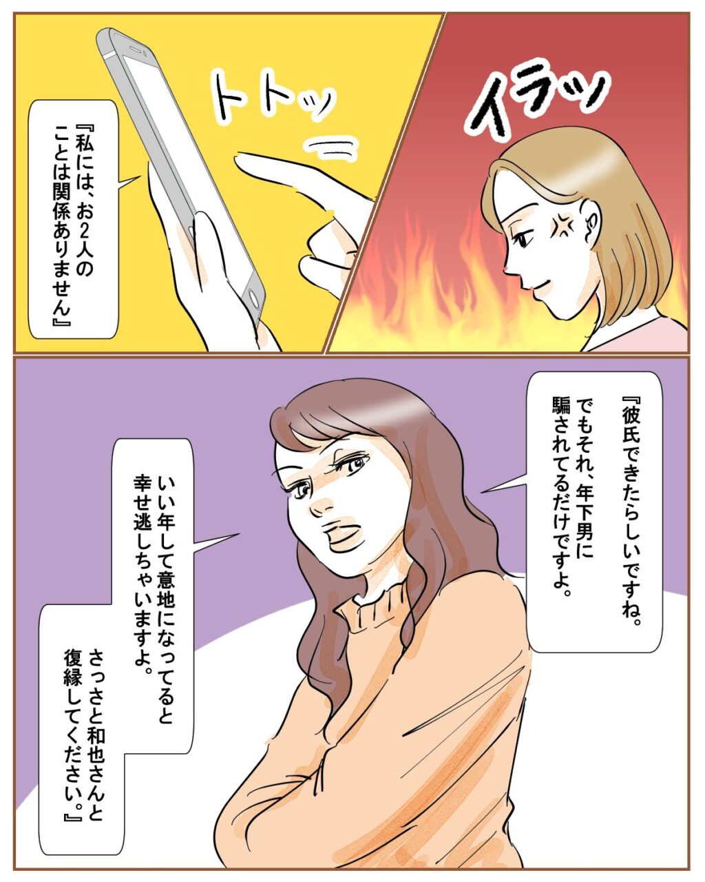 和也もほなみさんも本当に自分勝手!二人のいざこざに私を巻き込まないで欲しいです。だんだん腹が立ってきた私は「私にはお2人のことは関係ありません」と返すと、今度は「彼氏できたらしいですね。でもそれ、年下男に騙されてるだけですよ。いい年して意地になってると幸せ逃しちゃいますよ。さっさと和也さんと復縁してください」と失礼な言葉とともに和也を私に押し付けようとしてくるほなみさん。
