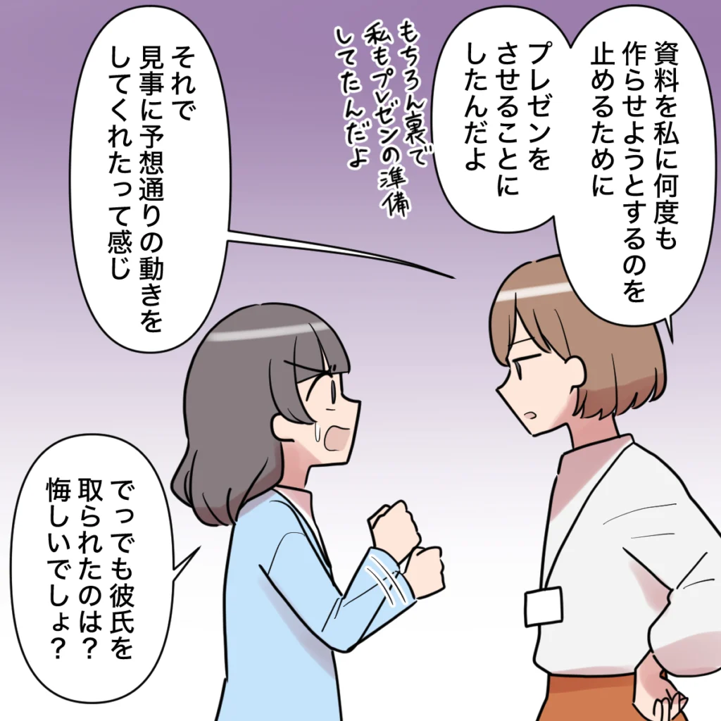 私は田中さんに、「資料を私に何度も作らせようとするのを止めるために、プレゼンさせることにしたんだよ」と、今回の得意先の件について種明かしをしました。田中さんがプレゼンを途中で投げ出すことは最初から想定していて自分でも準備を進めていたこと、そして田中さんが見事なまでに予想通りの行動を取ってくれたことも包み隠さず伝えました。すると田中さんは、「でっでも彼氏を取られたのは悔しいでしょ?」とよくわからない質問をしてきます。