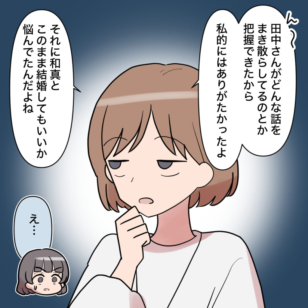 私は田中さんの質問に、「田中さんがどんな話をまき散らしてるのとか把握できたから、私的にはありがたかったよ・・・それに和真とこのまま結婚してもいいか悩んでたんだよね」と答えました。予想外の答えだったのか、田中さんは「え・・・」と表情を曇らせます。