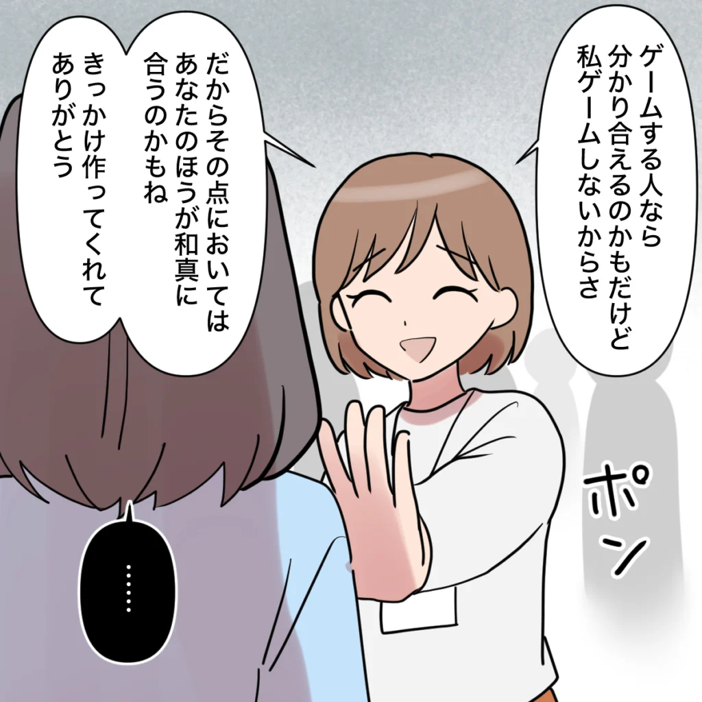 私は田中さんの肩をポンと押し、「ゲームする人なら分かり合えるのかもだけど、私ゲームしないからさ・・・だからその点においてはあなたのほうが和真に合うのかもね、きっかけ作ってくれてありがとう」と感謝の気持ちを伝えました。