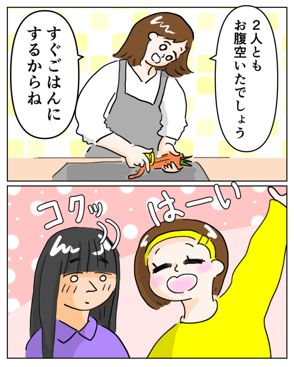 でも、まだ私たちは家族になったばかり。お互いに知らないこともたくさんあるし、これからゆっくり距離を縮めていけばいいよね。私は気持ちを切り替えて「2人ともお腹空いたでしょう、すぐごはんにするからね」と声をかけました。