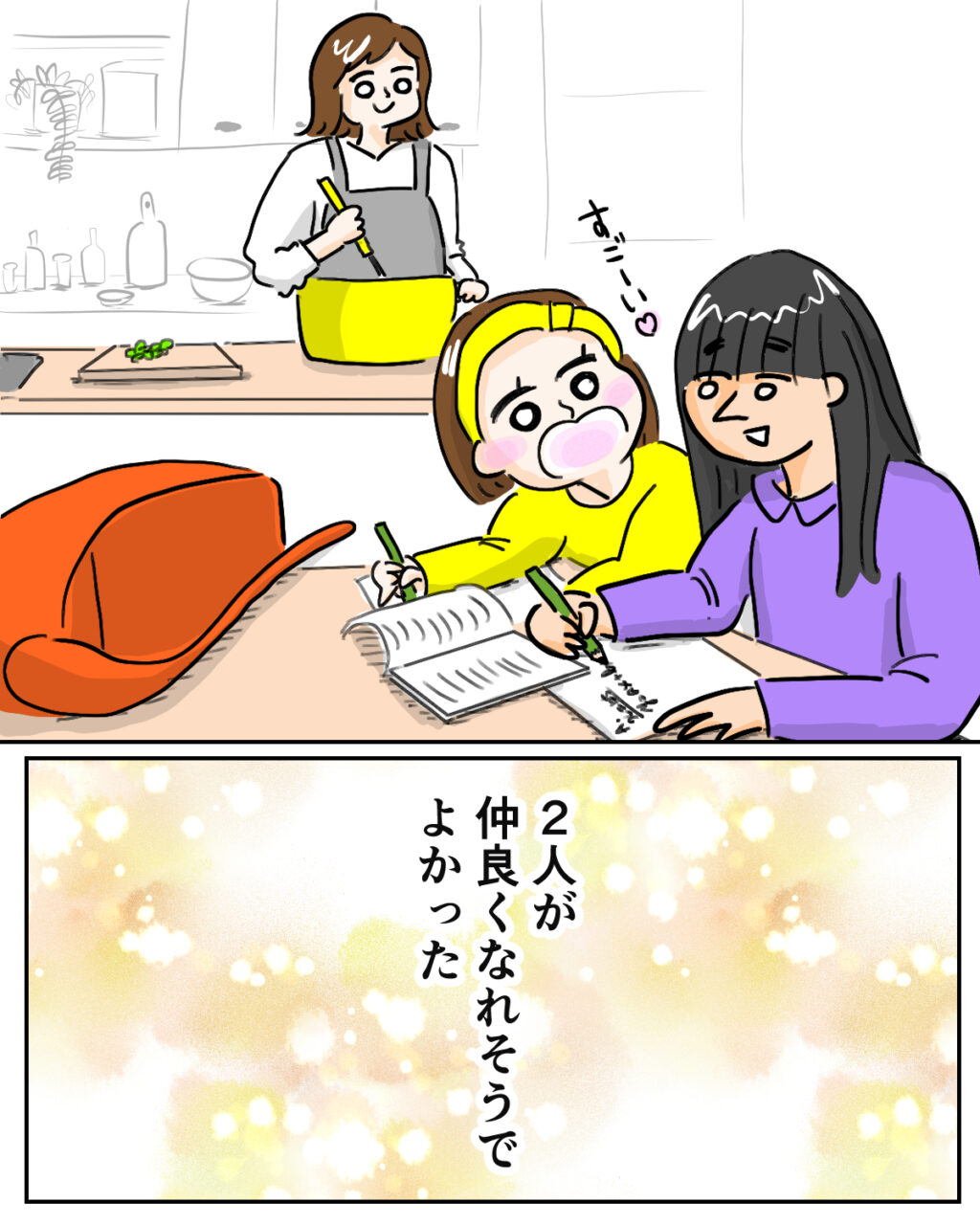 私はキッチンで晩ごはんの支度をしながら、仲良く宿題をする2人を眺めました。再婚を決めた時はどうなるか不安だったけど、2人が仲良くなれそうでほっとしました。焦らなくていい。これからゆっくり時間をかけて、家族になっていけたらいいな。