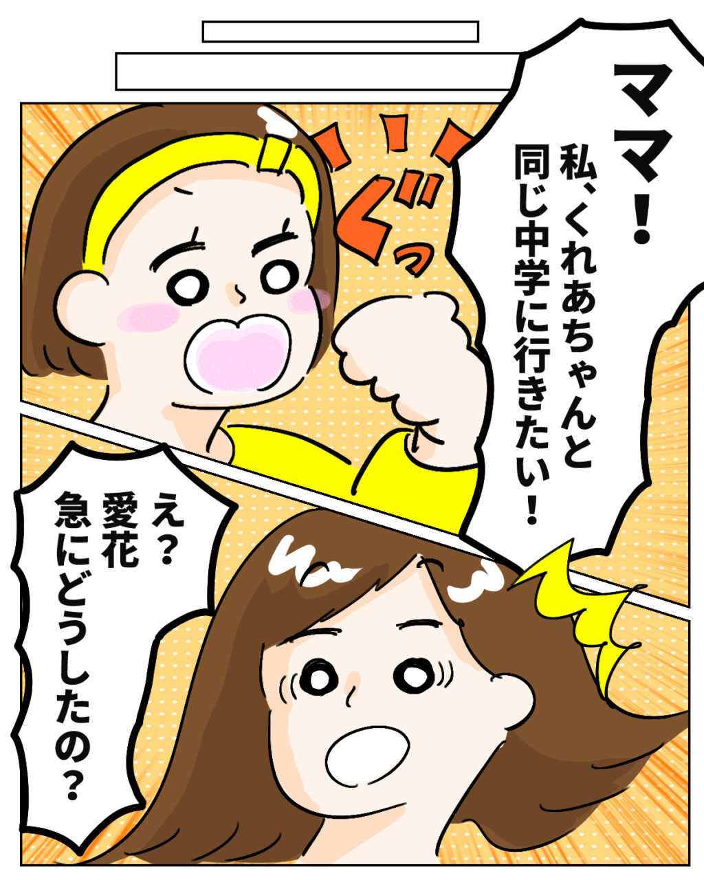 それから月日が流れ、4人での生活にもすっかり慣れてきた頃。愛花が突然、「ママ!私、くれあちゃんと同じ中学に行きたい!」と言い出しました。まさか愛花の口からそんな言葉が出るとは思っておらず、私は驚きのあまり目を丸くしてしまいました。