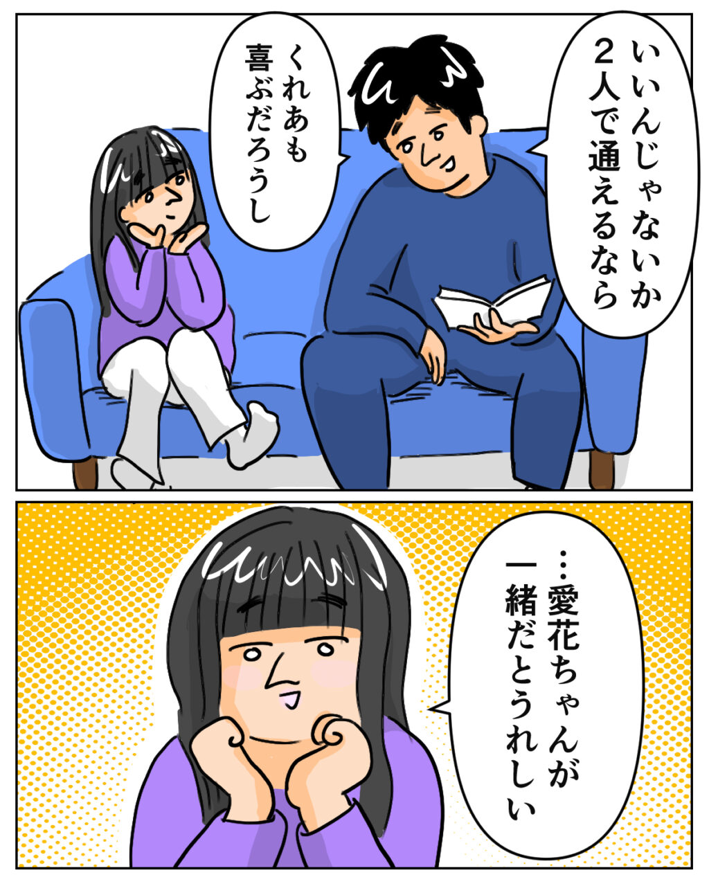 突然の宣言に戸惑う私とは対照的に、達夫さんは「いいんじゃないか2人で通えるなら、くれあも喜ぶだろうし」と前向きな反応。くれあちゃんも、少し照れたように「・・・愛花ちゃんが一緒だとうれしい」と微笑みました。