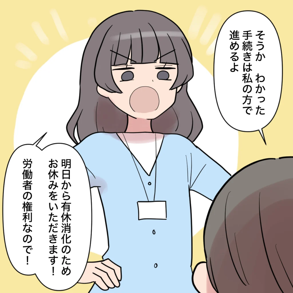 部長は田中さんの言葉に動揺することも、引き留めることもせず「わかった、手続きは私の方で進めるよ」と、淡々と答えます。田中さんは、「明日から有休消化のためお休みをいただきます!労働者の権利なので!」と一方的に言い、そのまま自分の席へ戻っていきました。