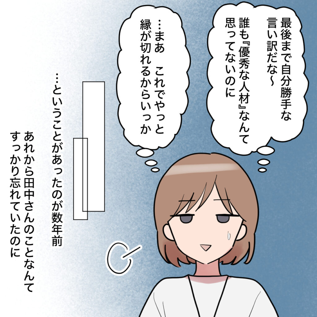 最後まで自分勝手な言い訳で辞めていった田中さん。誰も『優秀な人材』なんて思ってないのに、あの自信はどこから来るのか不思議でなりません。まぁ、これでやっと縁が切れるならいいか。
