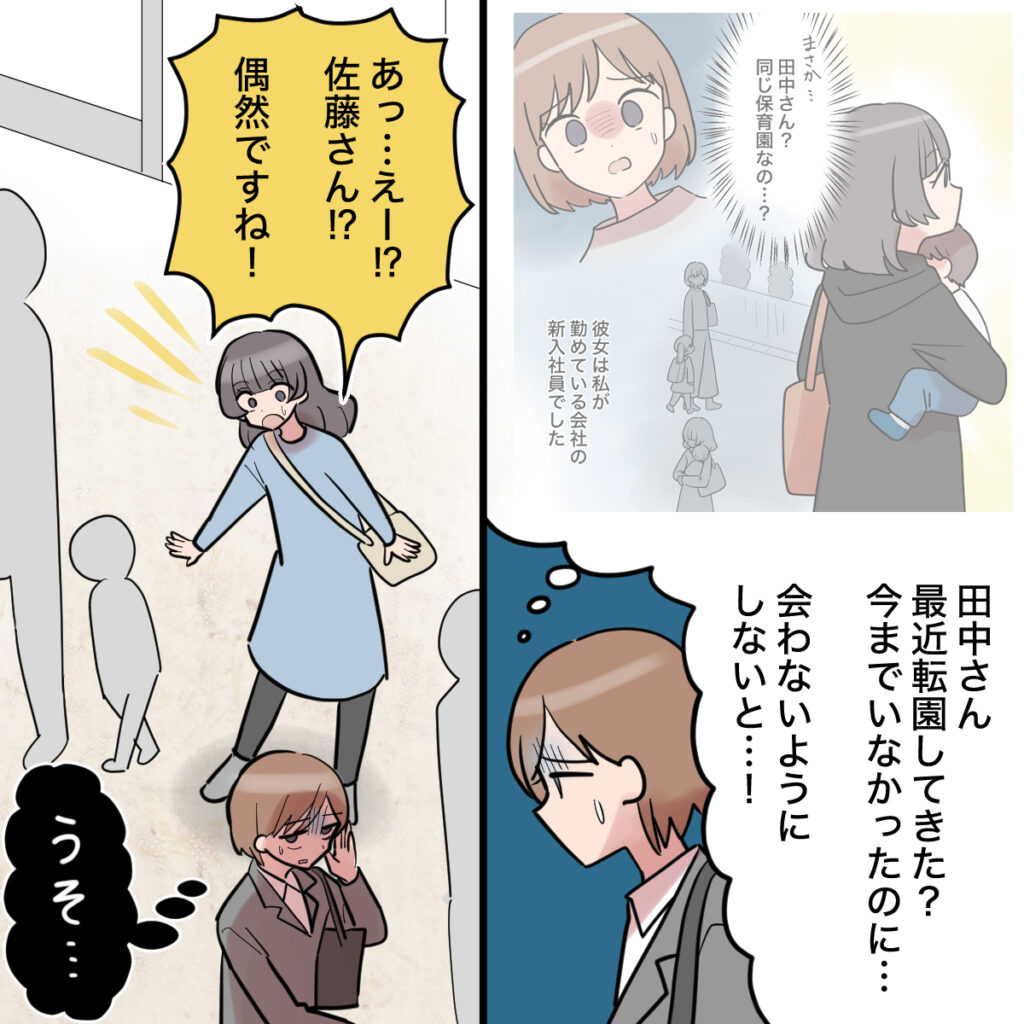 娘のスイが通う保育園で、田中さんの姿を見かけて驚きました。これまで見たことがなかったので、最近転園してきたんだと思います。私は関わりたくない一心で、必死に身を隠しながら田中さんの横を通り過ぎようとします。しかし、そんな願いも虚しく「あっ・・・えー!?佐藤さん!?偶然ですね」運悪く気づかれてしまいました。