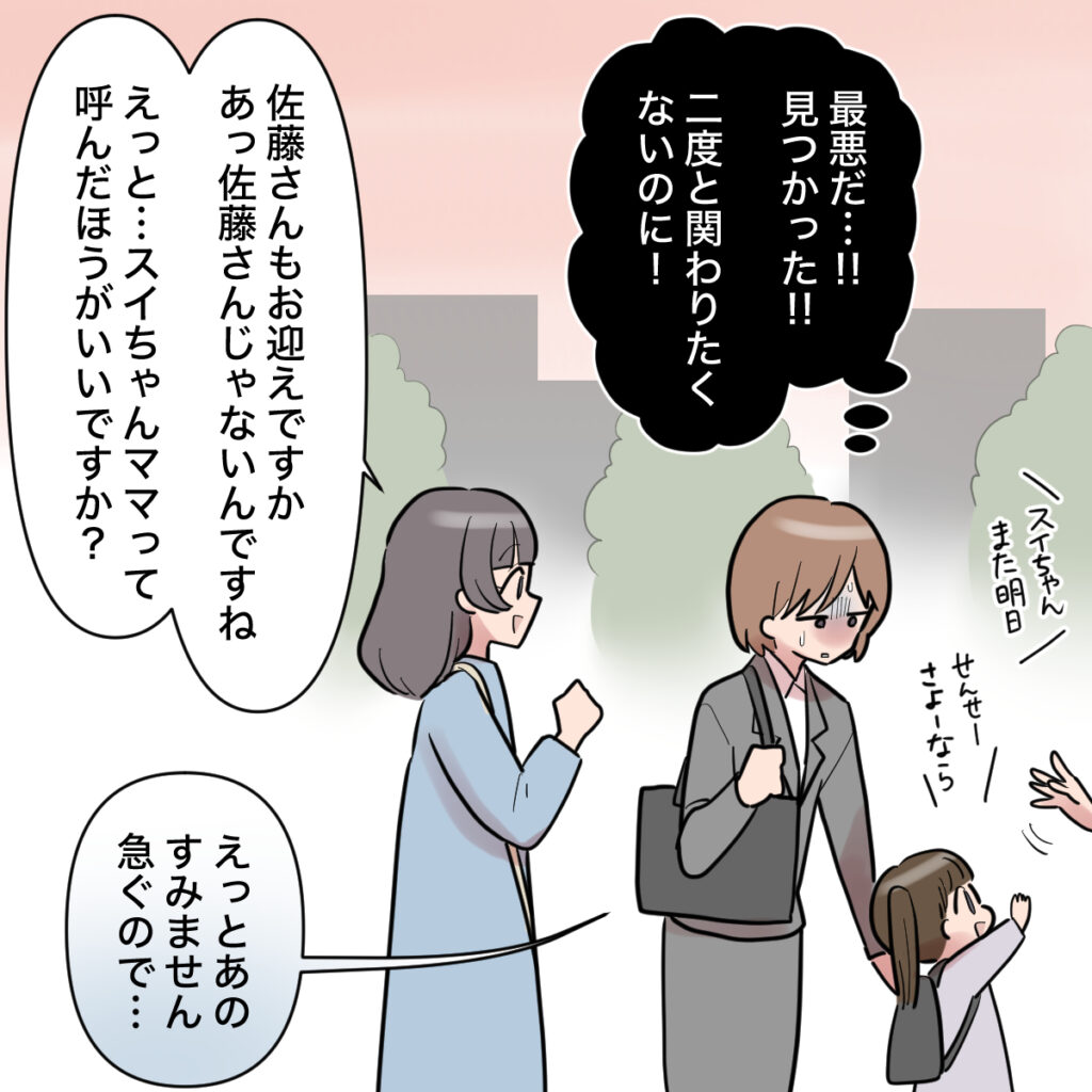 二度と関わりたくないと思っていたのに見つかってしまった・・・最悪。顔を青ざめる私をよそに、田中さんは「佐藤さんもお迎えですか?あっ、佐藤さんじゃなくてスイちゃんママって呼んだほうがいいですか?」と距離感ゼロの馴れ馴れしさで話しかけてきます。耐えきれなくなった私は、「すみません急ぐので」と足早にその場を後にしました。