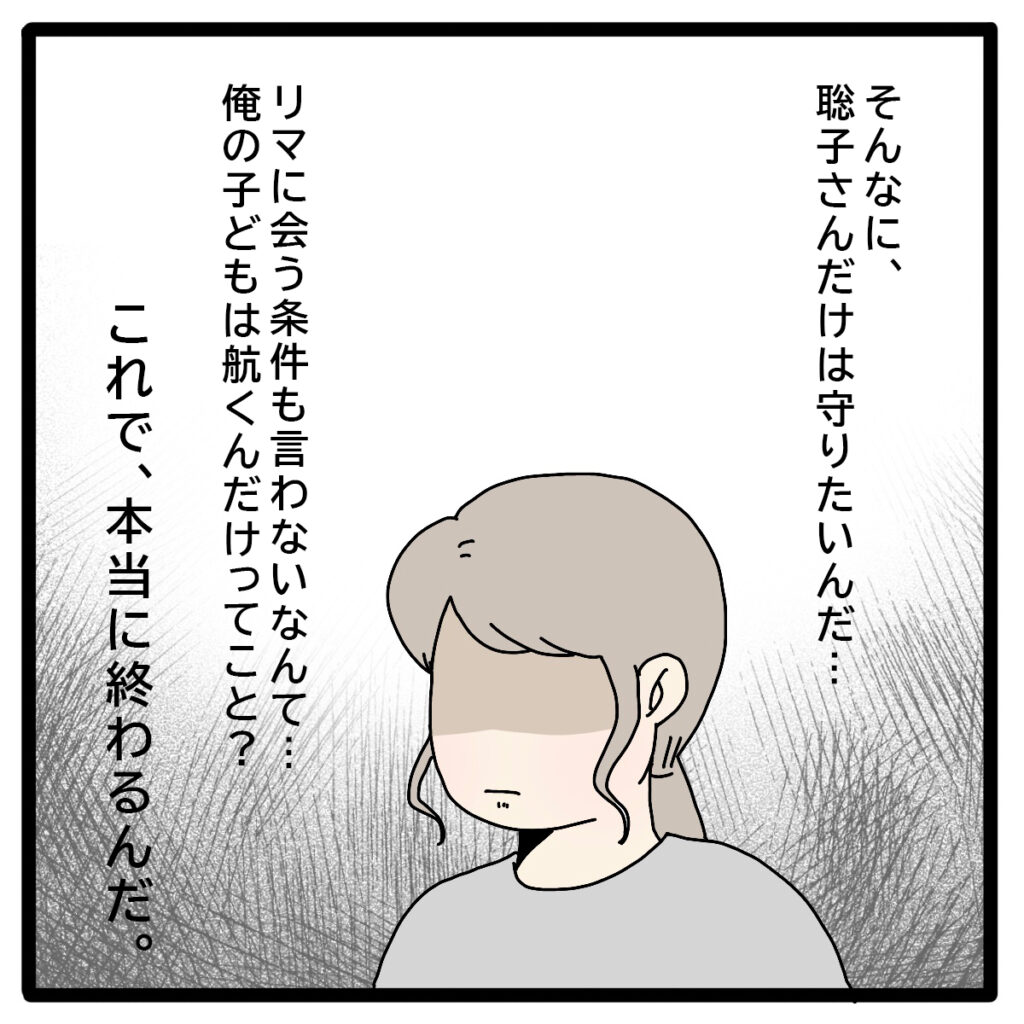 そんなに、聡子さんだけは守りたいんだ・・。リマに会う条件も言わないなんて・・俺の子どもは航くんだけってこと?普通は子どもとの面会頻度とかを言ってくるものなんじゃないの?正志の頭の中は聡子さんと航くんでいっぱいで、もうリマや私のことなどどうでもいいようです。これで、本当に終わるんだ。そう実感しました。