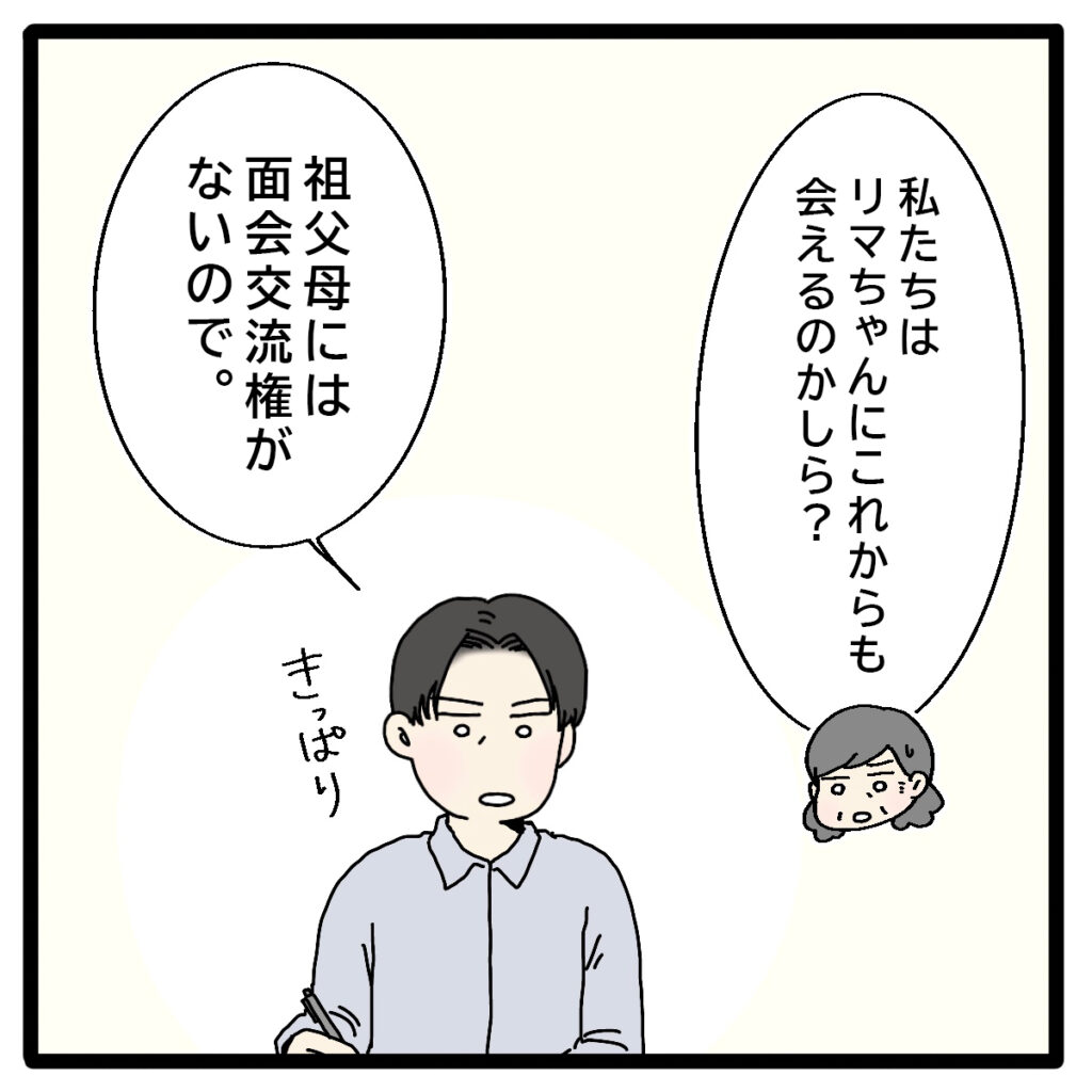 「私たちはリマちゃんにこれからも会えるのかしら?」と義母が心配そうに聞くと、兄が「祖父母には面会交流権がないので」ときっぱり否定。