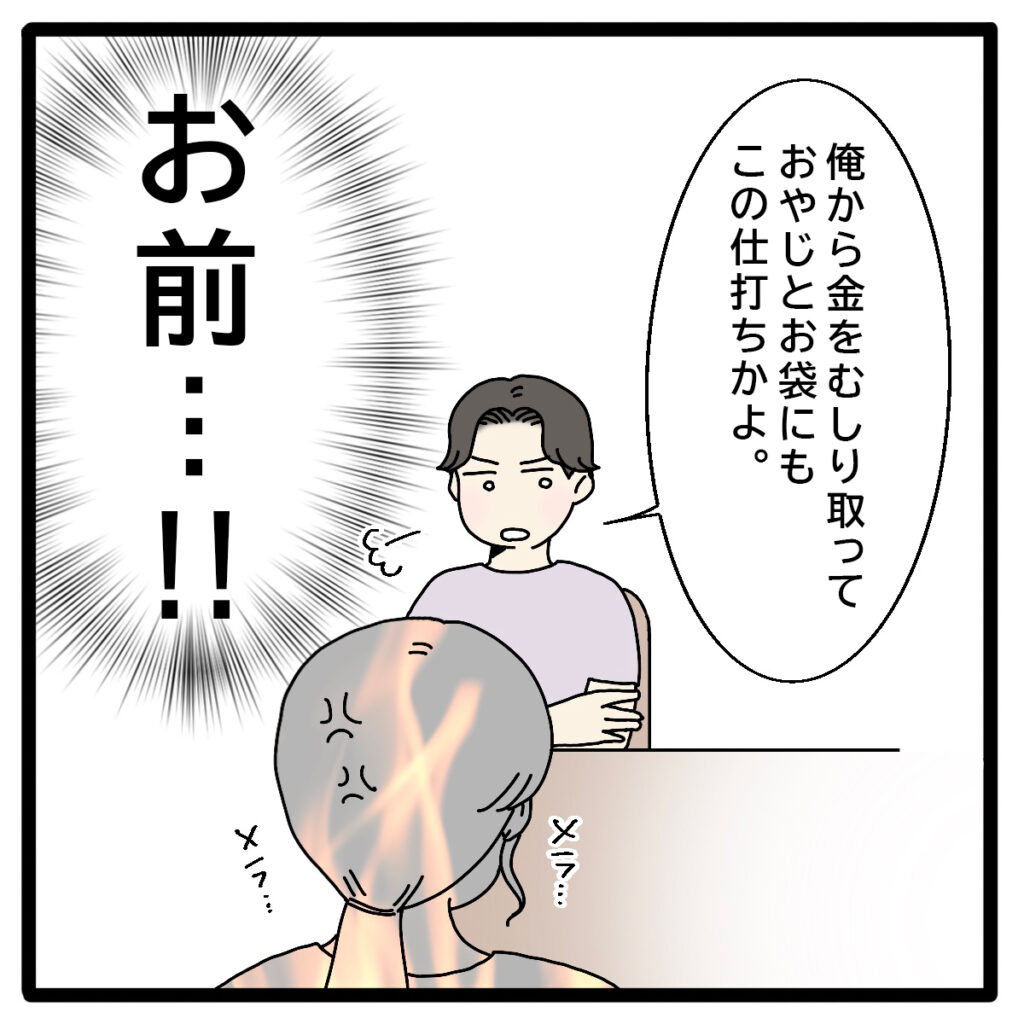 それを聞いた正志は「俺から金をむしり取って、おやじとお袋にもこの仕打ちかよ」と溜息まじりにぼそり。私が薄情者だとでも言いたげな正志の発言に「お前・・!!」と怒りがこみ上げましたが、グッと堪えました。自分の身勝手な行いがこの結果を招いているという自覚が全くない正志には怒りを通り越して呆れてしまいます。