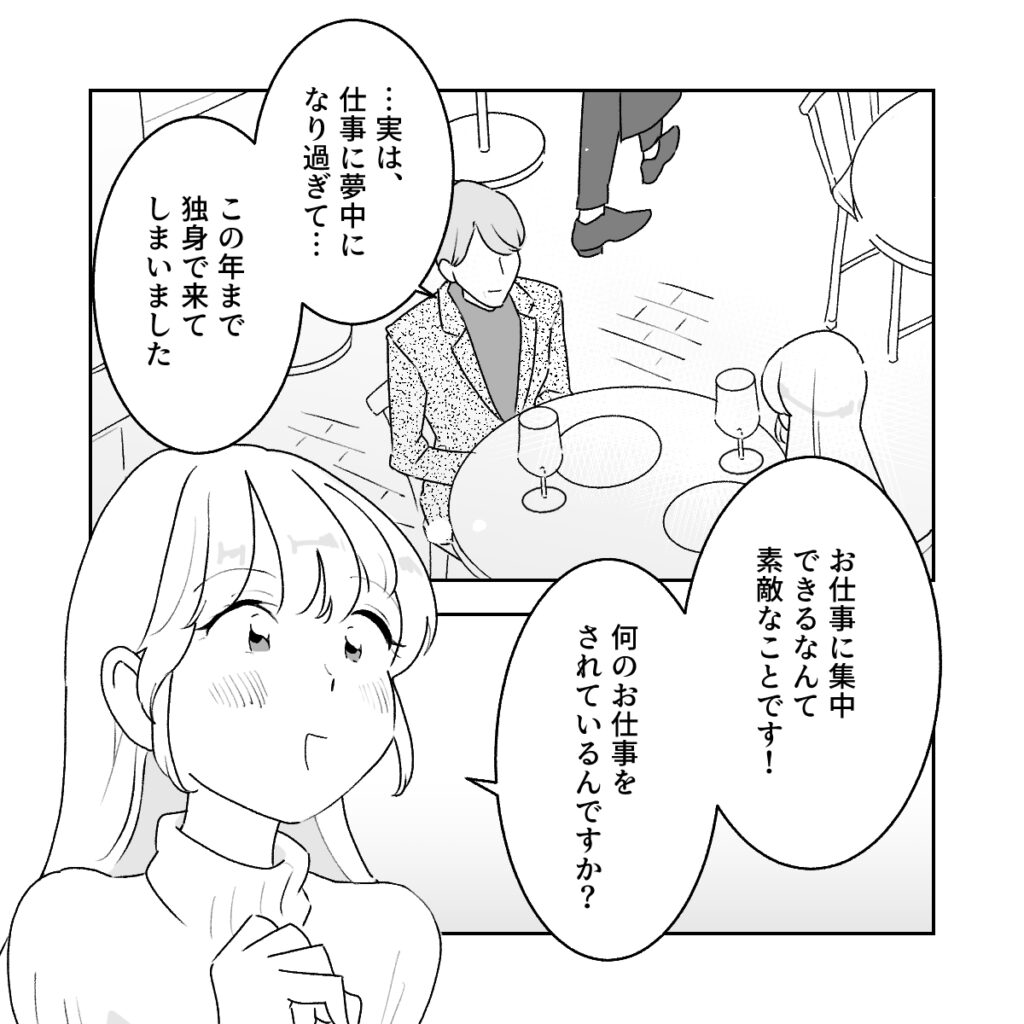 そして2回目のデート。和男さんが連れて来てくれたのは、大人な雰囲気のおしゃれなお店。和男さんは「・・実は、仕事に夢中になり過ぎて・・この年まで独身で来てしまいました」と苦笑いしながら話してくれ、「お仕事に集中できるなんて素敵なことです!何のお仕事をされているんですか?」と聞いてみました。