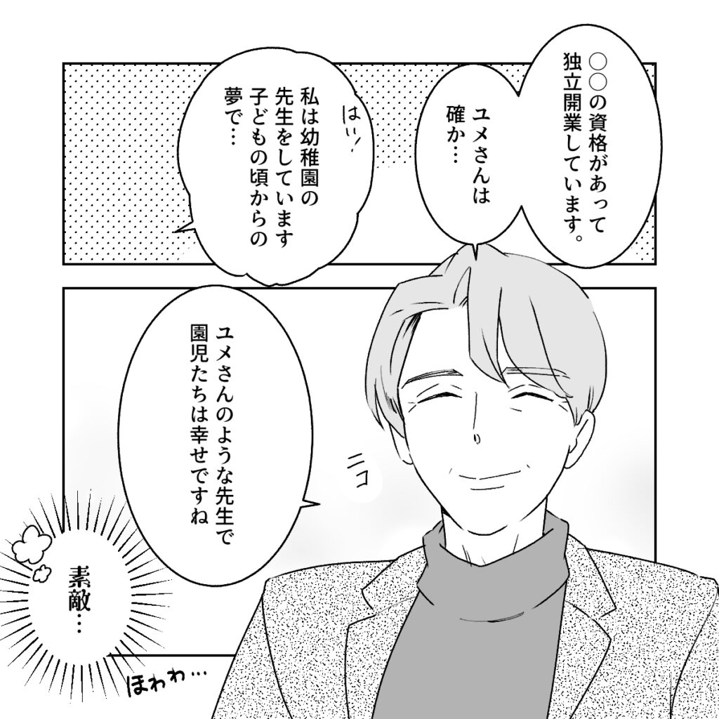 「〇〇の資格があって、独立開業しています。ユメさんは確か・・」と言うので「はい!私は幼稚園の先生をしています。子どもの頃からの夢で・・」と話すと、「ユメさんのような先生で園児たちは幸せですね」と微笑む和夫さん。独立開業してるなんてかっこいいし、私の仕事も褒めてくれて・・なんて素敵なの!