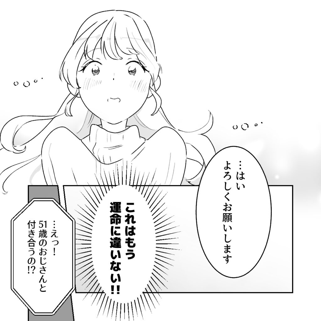 え・・こんな素敵な人から交際を申し込まれるなんて・・嘘みたいです。私は夢心地で「・・はい。よろしくお願いします」と答えました。これはもう運命に違いない!!和男さんはやっぱり私の王子様だったんだ!その夜、さっそくアキに電話して和男さんと付き合うことになったと報告すると、「・・えっ!51歳のおじさんと付き合うの!?」と驚かれました。