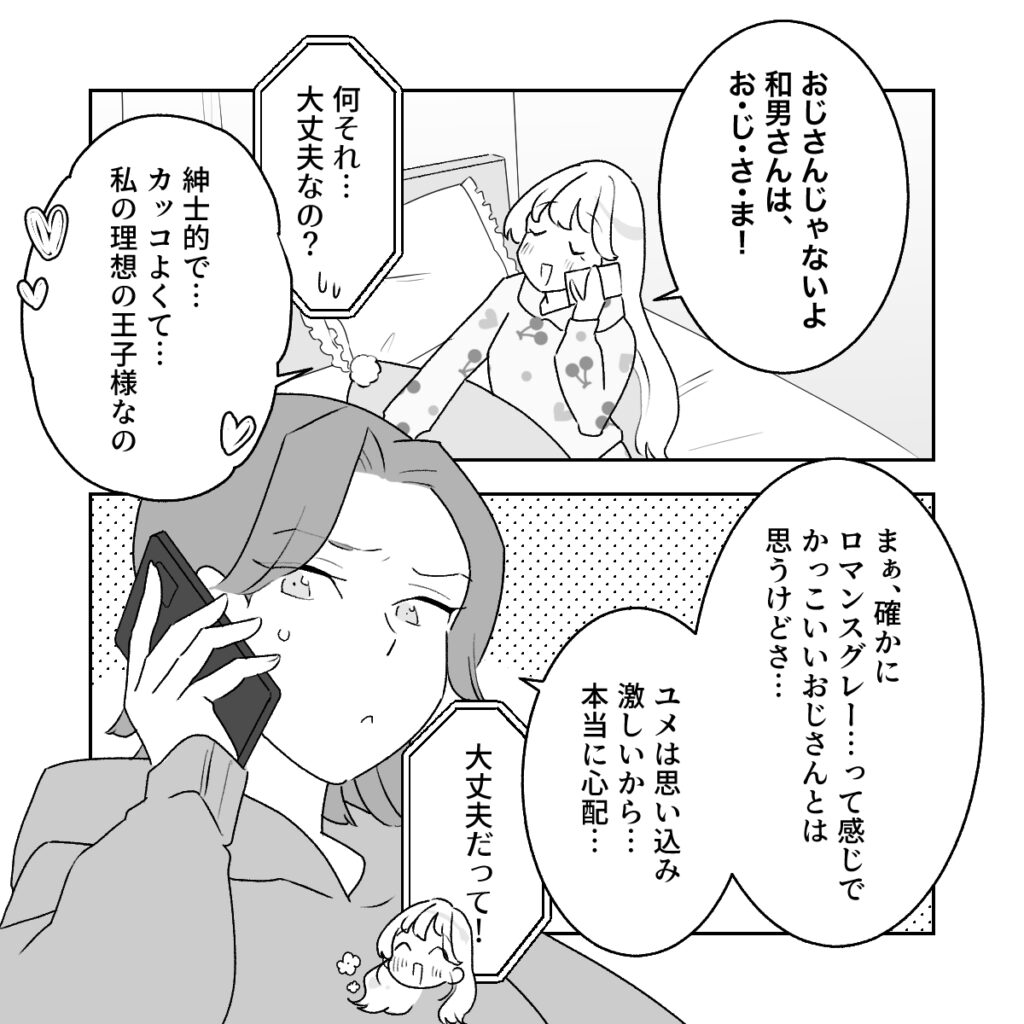 アキってば、あんなに素敵な和男さんのことをおじさん呼ばわりするなんて、失礼しちゃう!和男さんをその辺のおじさんと一緒にしないでほしいです。「おじさんじゃないよ。和男さんは、お・じ・さ・ま!」私がそう訂正すると「何それ・・大丈夫なの?」とアキは微妙な反応をしましたが、「紳士的で・・カッコよくて・・私の理想の王子様なの」と私は和男さんがどれほど素敵な男性かを力説。それでも「まぁ、確かにロマンスグレー・・って感じでかっこいいおじさんとは思うけどさ・・。ユメは思い込みが激しいから・・本当に心配・・」とアキは心配していました。「大丈夫だって!」私は自信満々で断言して電話を切りました。アキには和男さんの魅力が伝わっていないようで残念ですが、私は和男さんと付き合えたことが嬉しくて堪りませんでした。