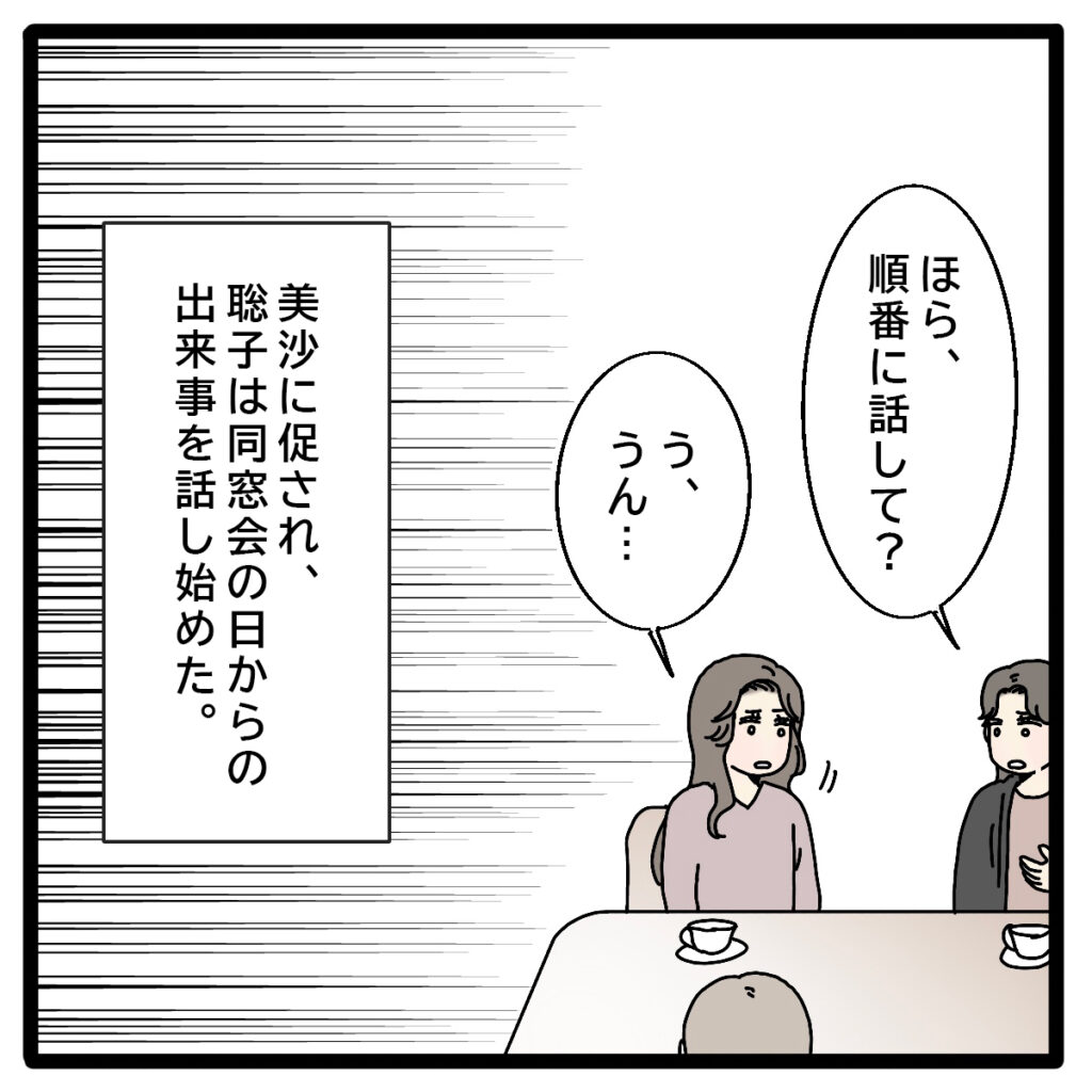 「ほら、順番に話して?」美沙ちゃんにそう促され、聡子さんは同窓会の日からの出来事をぽつりぽつりと話し始めました。聡子さんの様子から、正志と彼女の間には私の知らない何かがあると察しました。