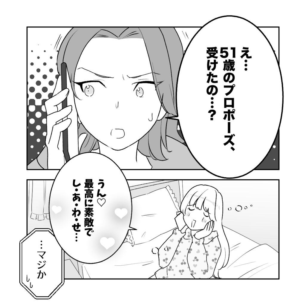 その日の夜。アキに和男さんからプロポーズされたことを話すと、「え・・・51歳のプロポーズ受けたの?」と引き気味。しかし、幸せで舞い上がっていた私は彼女の反応など気にも留めず、「うん、最高に素敵でしあわせ」と上の空。そんな私を見て、アキは「マジか・・・」とつぶやきました。