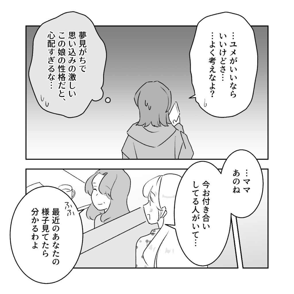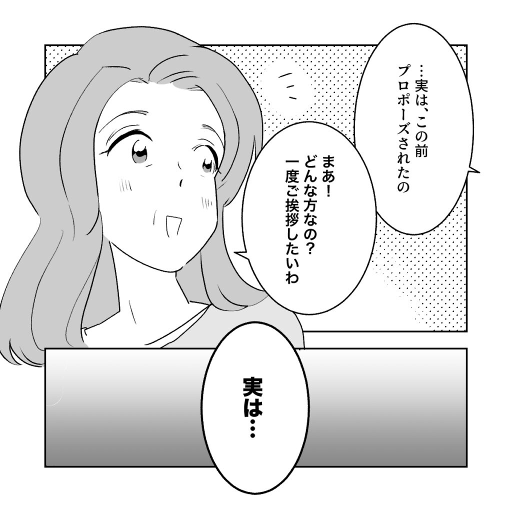 アキは、夢見がちで思い込みの激しい私を心配したのか、「・・・ユメがいいならいいけどさ、よく考えなよ」と念を押すように言いました。その後、プロポーズされたことを両親に伝えようと、リビングにいるママに声をかけます。「ママあのね、今お付き合いしてる人がいて・・・」私がそう切り出すと、ママは嬉しそうに「最近のあなたの様子を見てたらわかるわよ」と微笑みました。