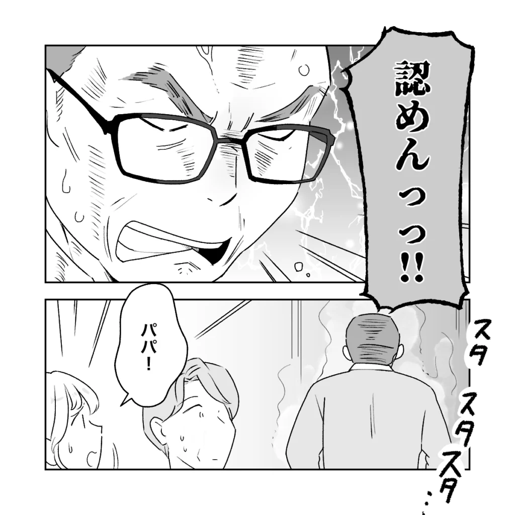 和男さんの挨拶の言葉を遮って、パパは「認めんっっ!!」とひと言吐き捨てて、部屋を出て行ってしまいました。ひどい。せっかく和男さんが来てくれたのに。