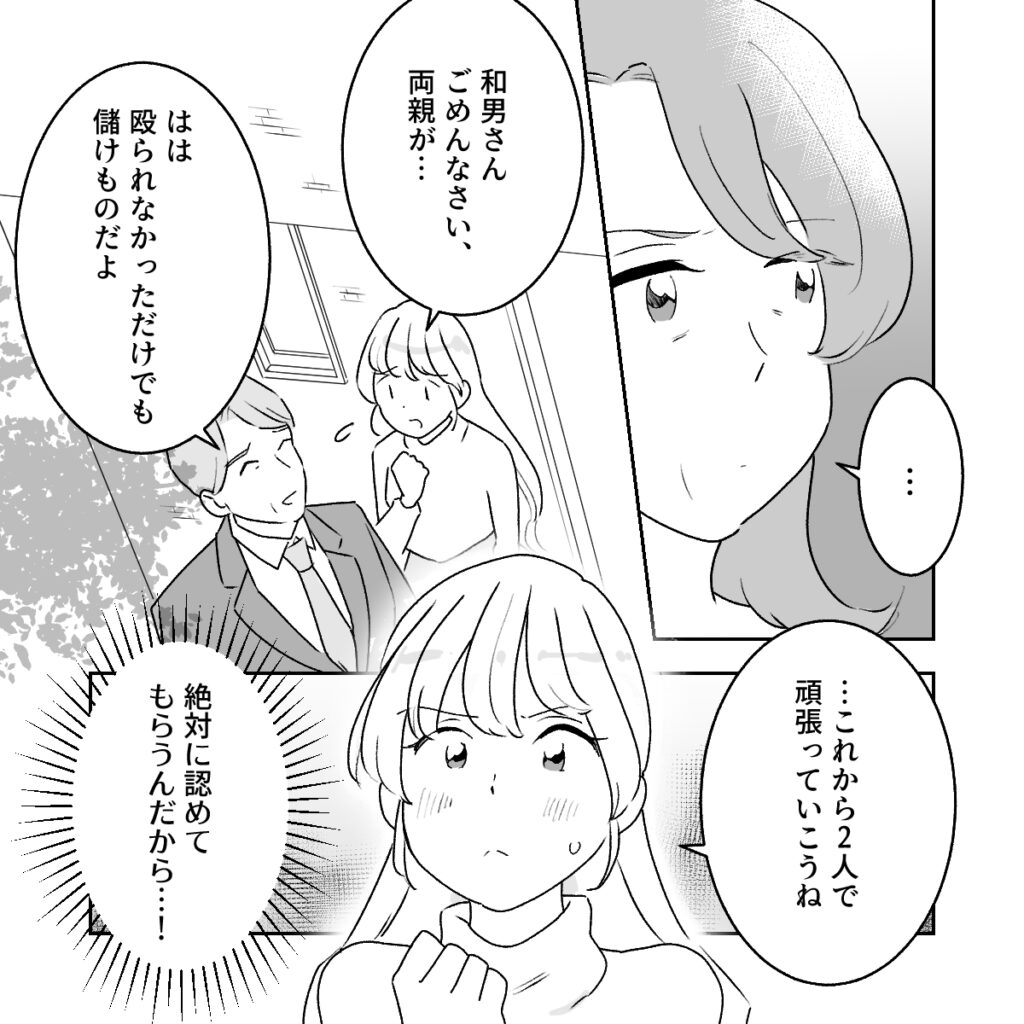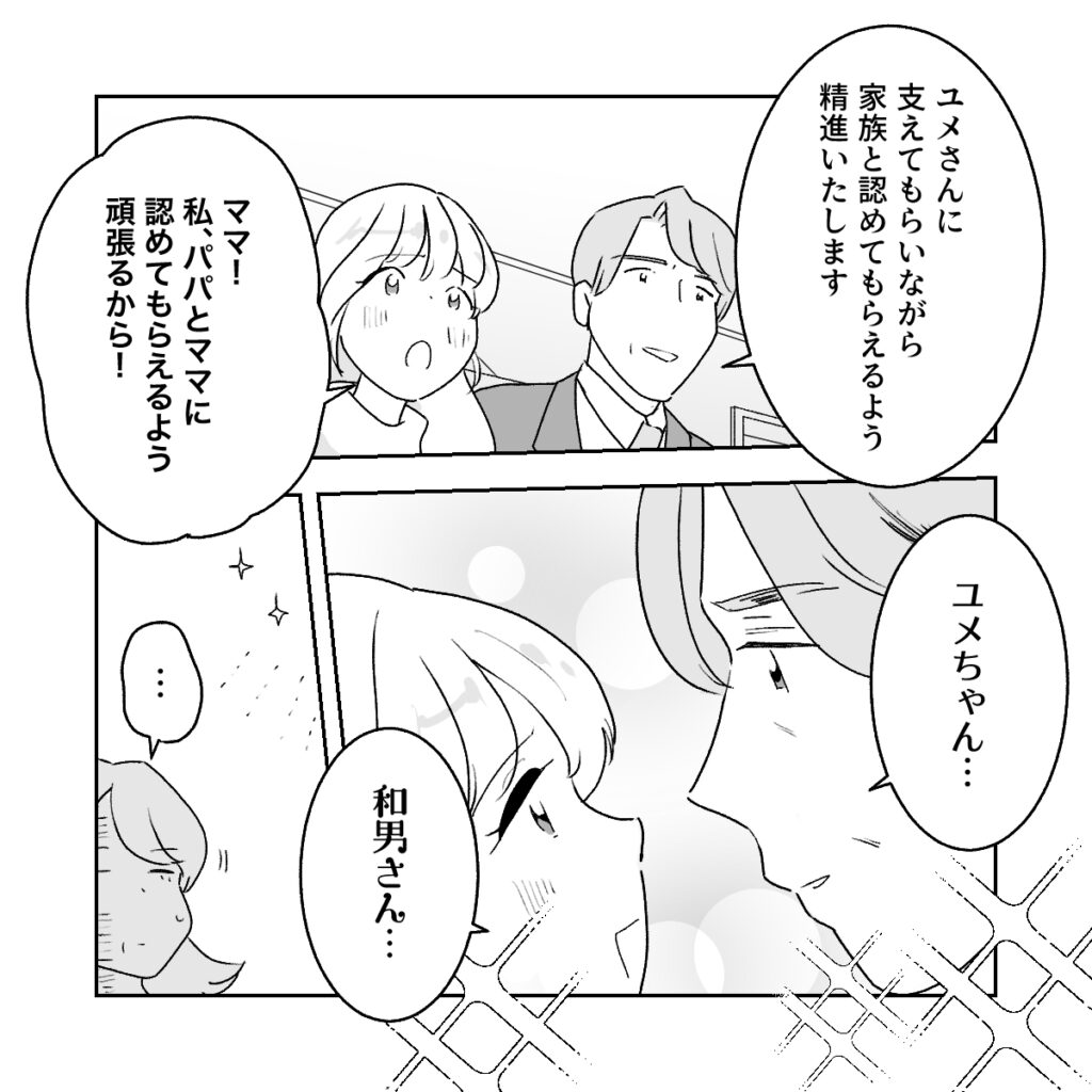 和男さんは、家族と認めてもらえるように精進しますとママに言ってくれました。私だって同じ気持ち!和男さんと一緒ならなんだって乗り越えられるから、今は無理でもパパとママに認めてもらえるように頑張ると宣言しました。