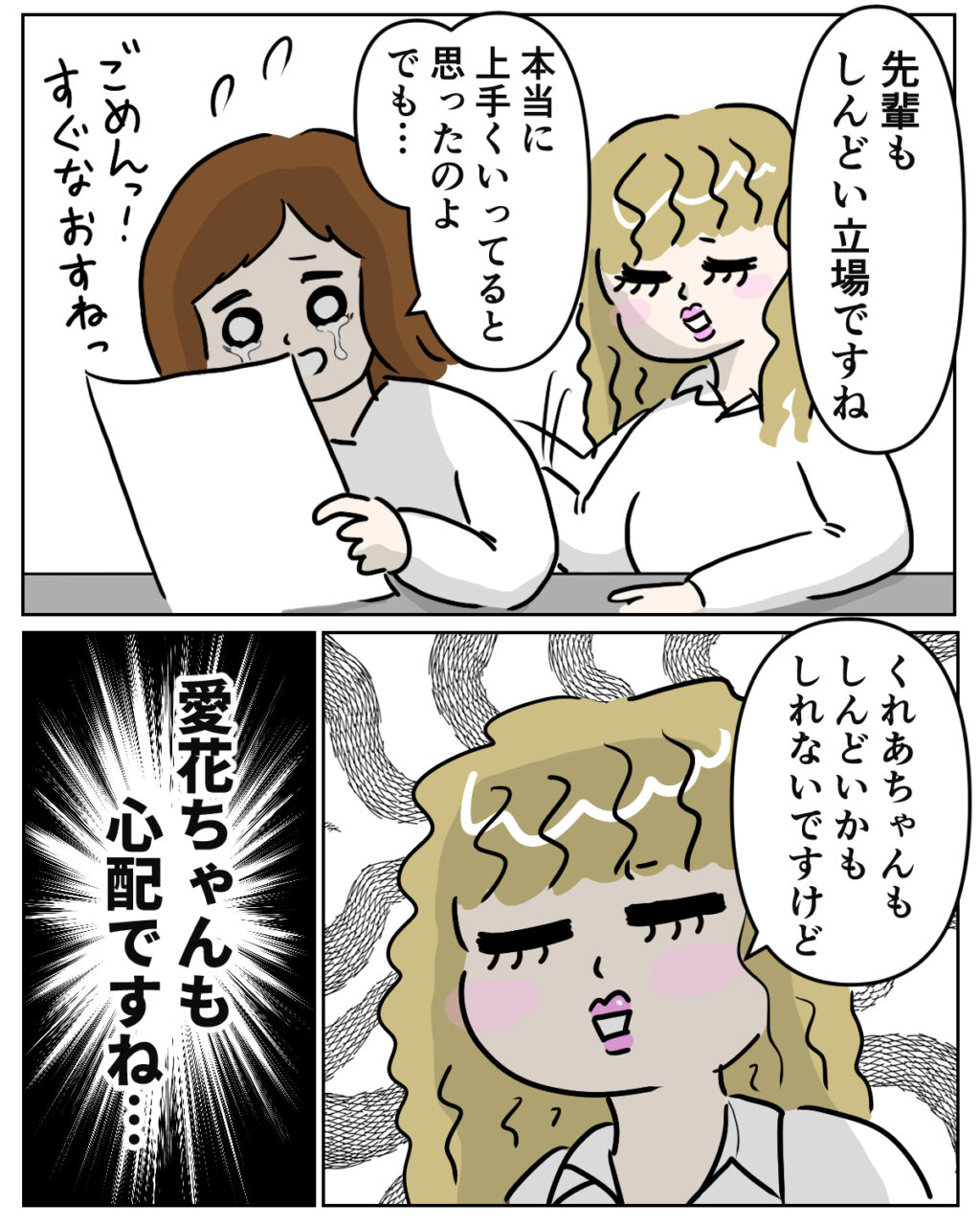 りえちゃんにくれあのことを聞いてもらいました。すると、「先輩もしんどい立場ですね」と慰めてくれ、「本当に上手くいってると思ったのよ。でも・・」と話しているとまた涙が。必死にこらえ資料を直そうとすると、「くれあちゃんもしんどいかもしれないですけど、愛花ちゃんも心配ですね・・」とりえちゃんが言い、