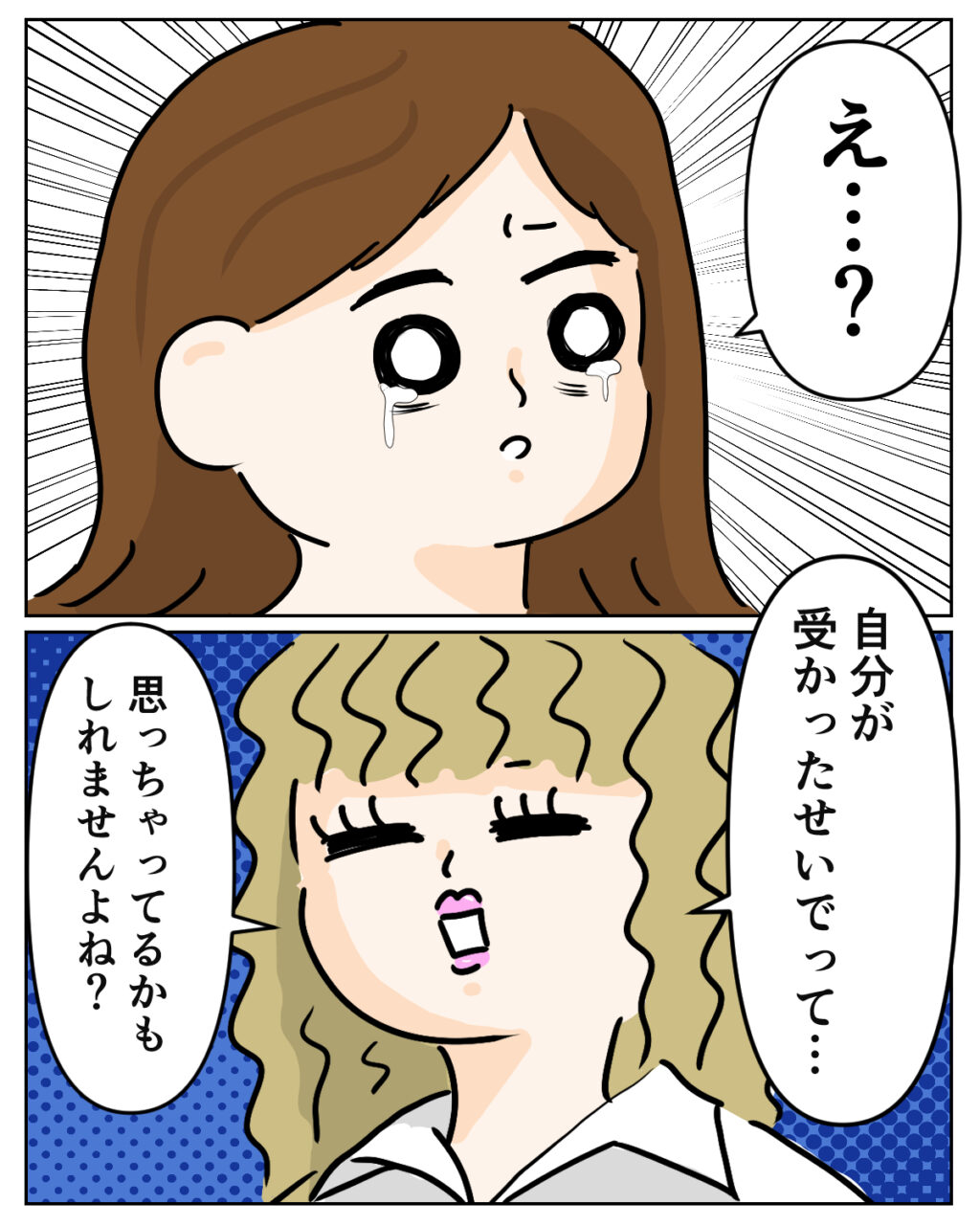 ある日仕事をしていると、後輩のりえさんに「先輩、誤字ってますよ~」と指摘され、りえさんの顔を見てこぼれる由以子さん。しっかり話を聞いてくれた上に「愛花ちゃんも心配ですね。自分が受かったせいで・・って思っちゃってるかも」と冷静な忠告、りえさんのおかげで、愛花ちゃんも辛いということにやっと気づけたのではないでしょうか。