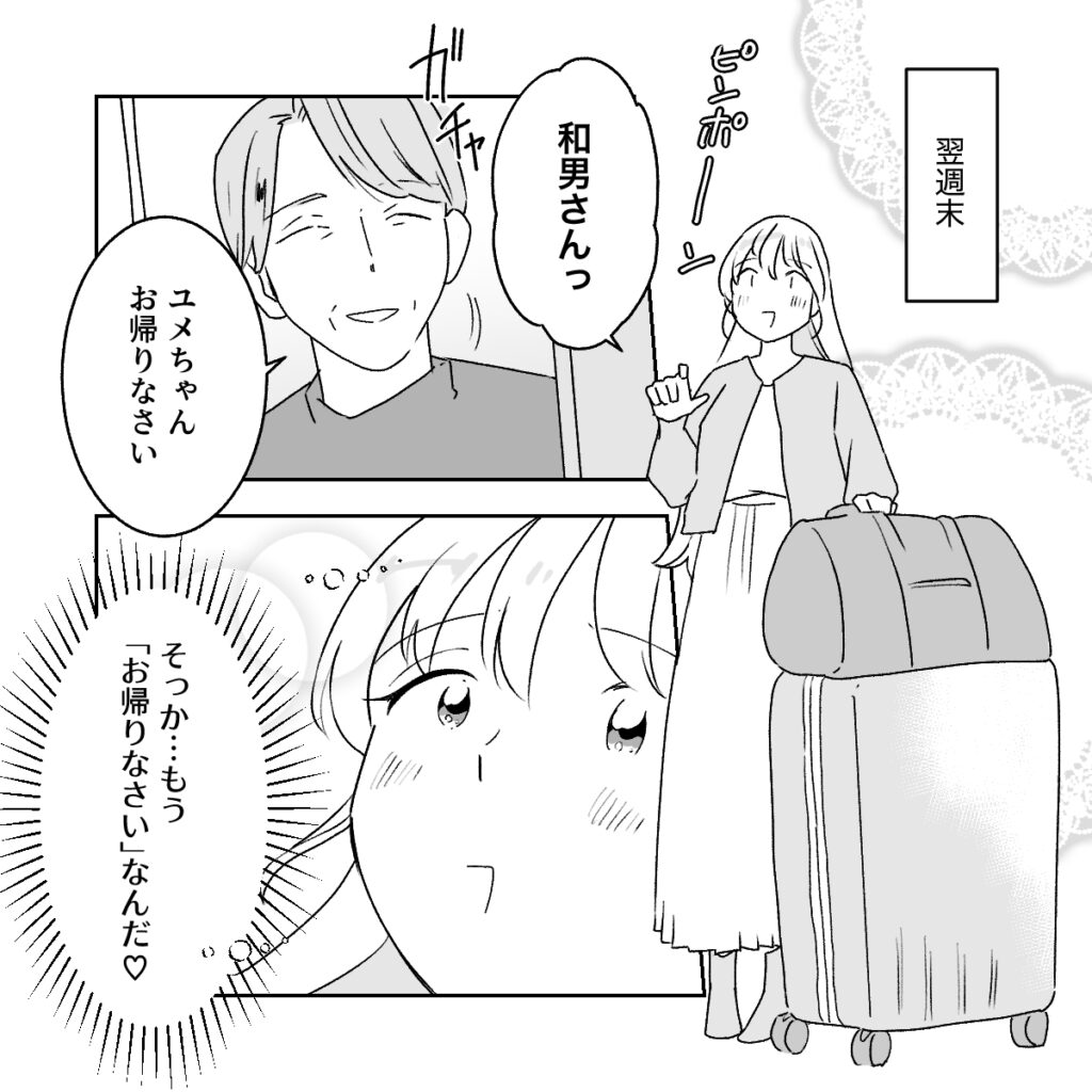 そして翌週末、予定どおり私は和男さんの家へ向かいました。ひとまず持てる分だけの荷物をスーツケースとボストンバッグに入れ、ドキドキしながらインターホンを押すと、「ユメちゃんお帰りなさい」と和男さんが笑顔で出迎えてくれました。そっか・・もう「いらっしゃい」じゃなくて「お帰りなさい」なんだ・・!今日からここで和男さんとの新婚生活が始まるという実感が一気に湧いて胸が躍りました。
