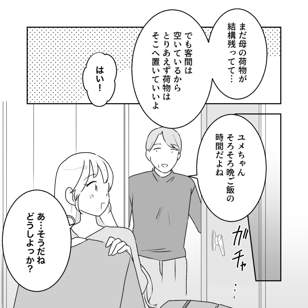 中に入ると、「まだ母の荷物が結構残ってて・・。でも客間は空いているからとりあえず荷物はそこへ置いていいよ」と和男さんが客間へ案内してくれました。持ってきた荷物を整理していると「ユメちゃん、そろそろ晩ご飯の時間だよね」と和男さんが声をかけてくれた。どこかに食べに連れて行ってくれるのかなと思いながら「あ・・そうだね。どうしよっか?」と答えると、