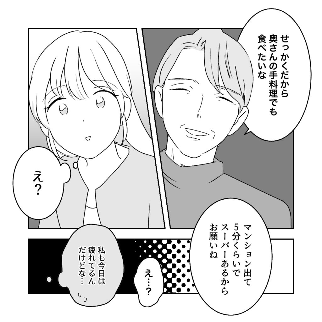 和男さんは「せっかくだから奥さんの手料理でも食べたいな」とにっこり。予想外の言葉に驚いてすぐに返事ができないでいると、「マンション出て5分くらいでスーパーあるからお願いね」と私の返事を待たずに和男さんが言いました。あれ?私の意見は聞いてくれないの・・?今までなら「何が食べたい?」とか聞いてくれていたのに・・。それに、私も今日は荷物を運んだり片付けたりして疲れてるんだけどな・・。