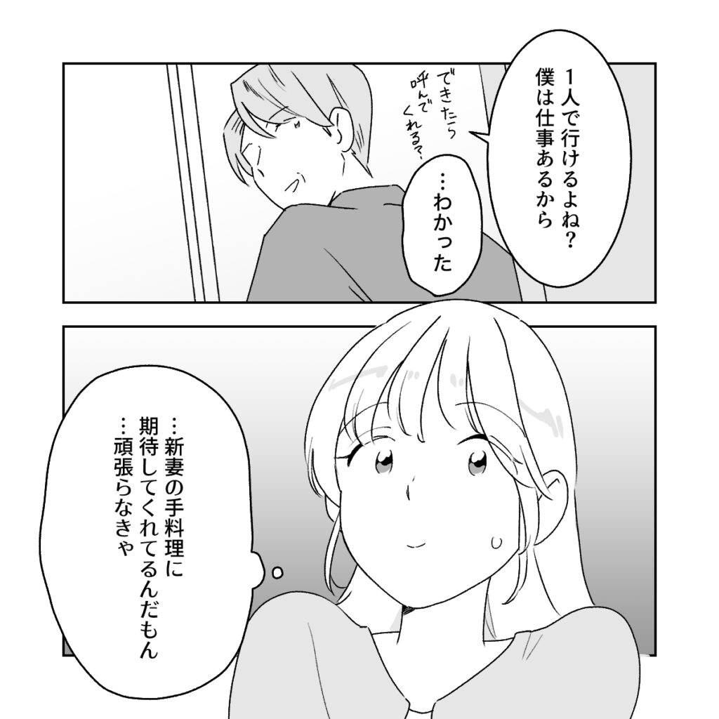 今までとはなんとなく違うように感じる和男さんの態度に違和感を覚えつつも、私が作って当然という雰囲気で嫌とは言いにくい・・。あれこれ考えていると「1人で行けるよね?僕は仕事あるから。できたら呼んでくれる?」と言って自分の部屋に戻っていく和男さん。私は戸惑いながらも「・・わかった」と言うしかありませんでした。本当は疲れてるし外に食べに行くかデリバリーとかにしたいけど・・新妻の手料理に期待してくれてるんだもん。・・頑張らなきゃ。私は気を取り直して晩ご飯の材料を買いに行きました。