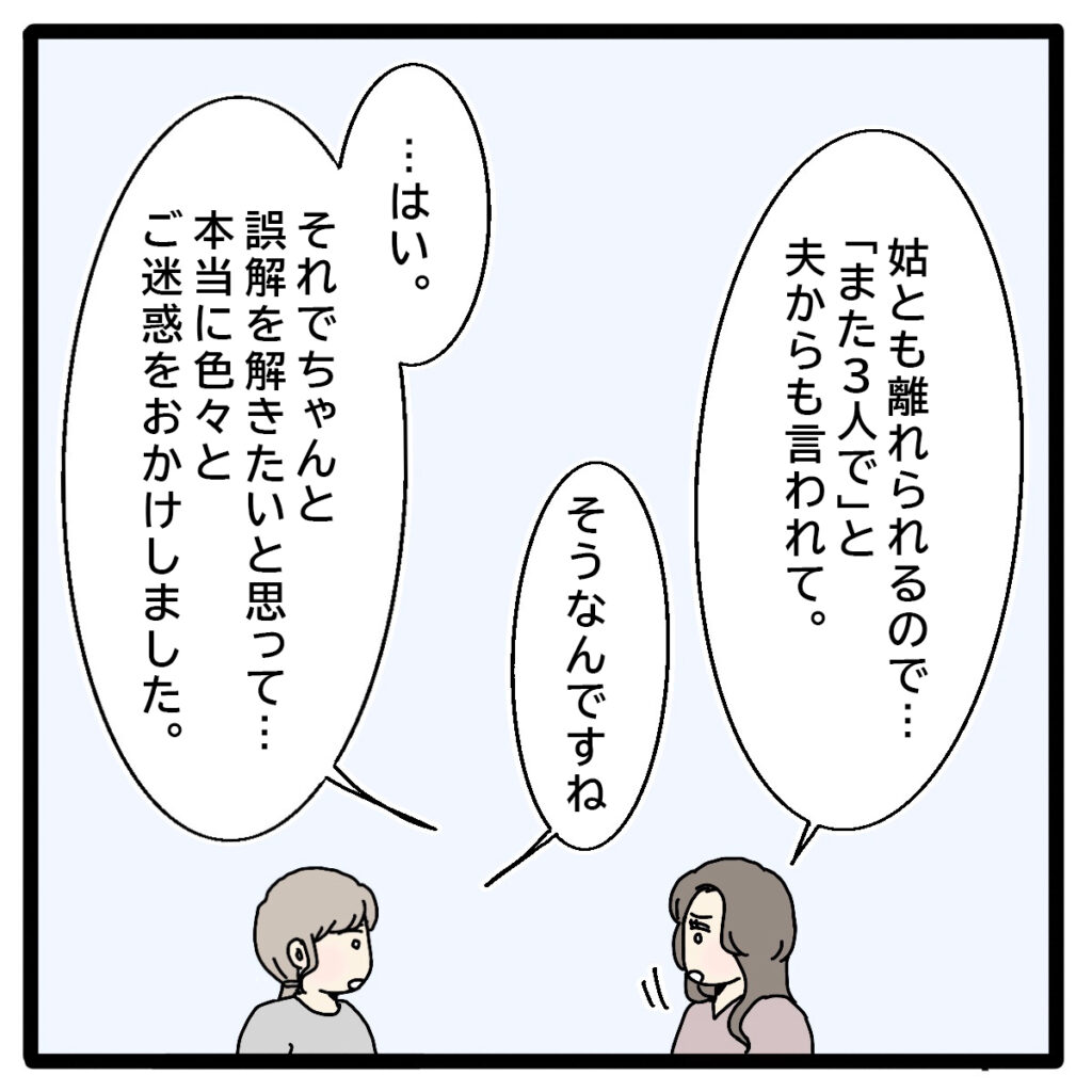 「姑とも離れられるので・・『また3人で』と夫からも言われて」聡子さんの言葉に「そうなんですね」と答えると、「・・はい。それでちゃんと誤解を解きたいと思って・・。本当に色々とご迷惑をおかけしました」と聡子さんに言われました。