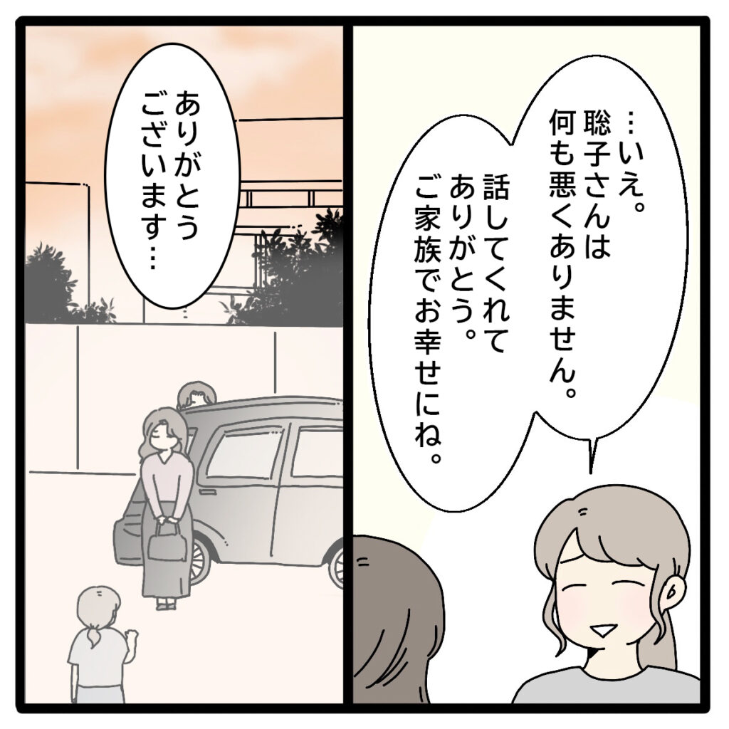 「・・いえ。聡子さんは何も悪くありません。話してくれてありがとう。ご家族でお幸せにね」そう言うと、聡子さんは「ありがとうございます・・」と感謝の言葉を残し、美沙ちゃんとともに去って行きました。