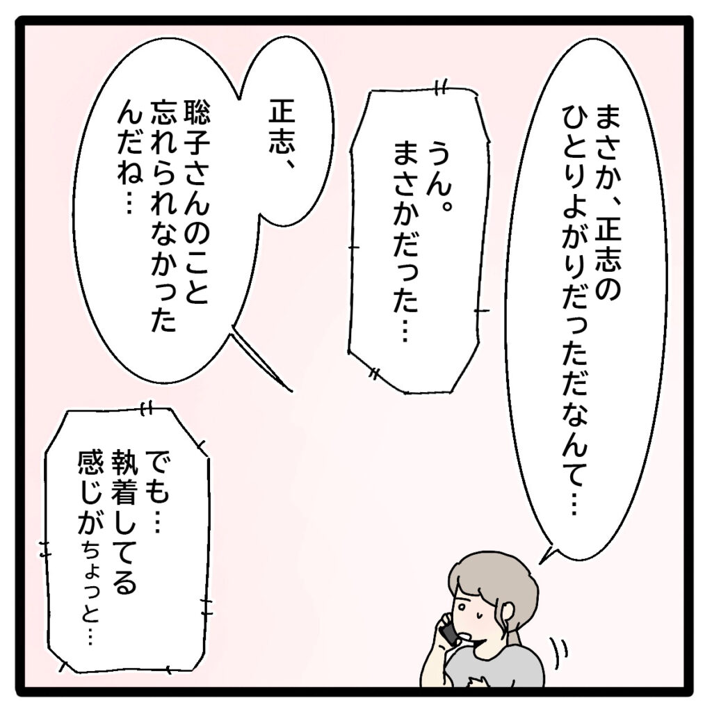 「まさか、正志のひとりよがりだっただなんて・・」私も驚いてそう答えると、「うん。まさかだった・・」と美沙ちゃん。「正志、聡子さんのこと忘れられなかったんだね・・」私がそう言うと、「でも・・執着してる感じがちょっと・・」と何と言っていいのかと言葉を濁しながら美沙ちゃんが言いました。