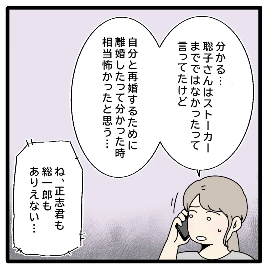 「分かる・・聡子さんはストーカーまではなかったって言ってたけど、自分と再婚するために離婚したって分かった時相当怖かったと思う・・」聡子さんの気持ちになって私がそう言うと、「ね、正志くんも総一郎もありえない・・」と美沙ちゃんが呟くように言いました。
