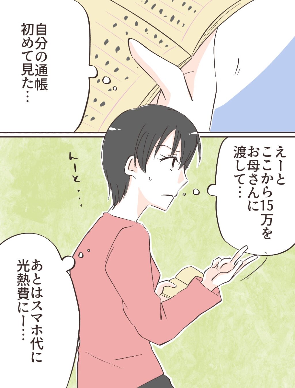 やっと手にできた自分の通帳。これまで給料はすべて母が管理していたから、こうして自分で通帳を見るのは初めてでした。記帳された金額を眺めながら、そこから母に渡す仕送りの15万円を差し引き、残りを生活費に回す計算を頭の中でします。・・・やっぱり、仕送りの額が大きい。自由に使えるお金はほんのわずかでした。