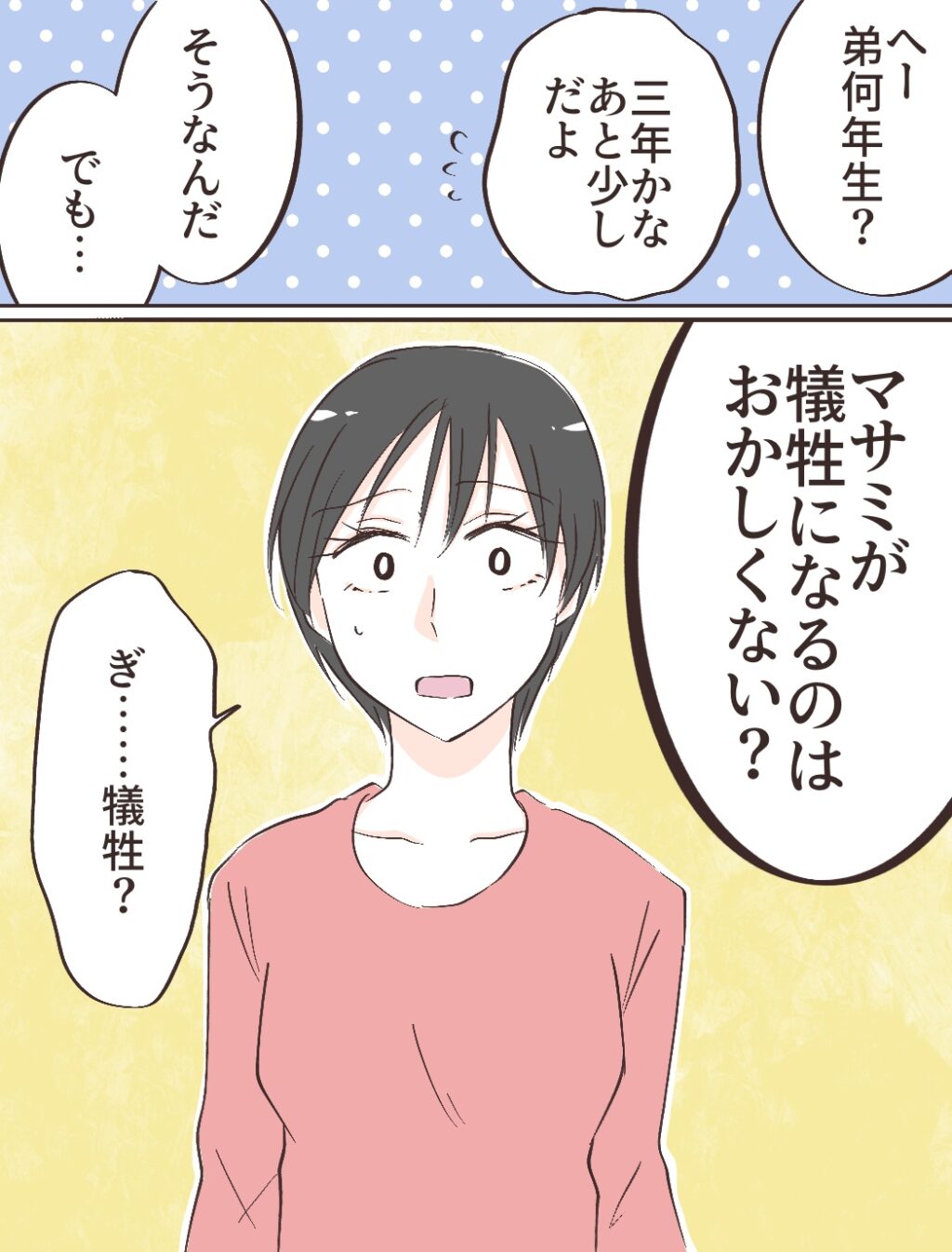 「へー弟何年生?」そう聞かれた私は「3年かな、あと少しだよ」と答えました。すると同僚は少し間を置いてから、「そうなんだ、でもマサミが犠牲になるのはおかしくない?」とズバリ言ったのです。思いもよらない言葉に、私は思わず「ぎ・・・犠牲?」と、その言葉を繰り返しました。